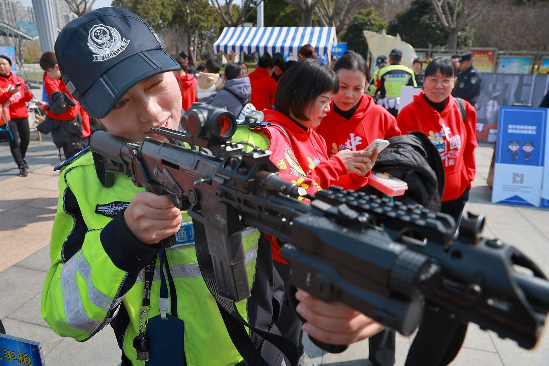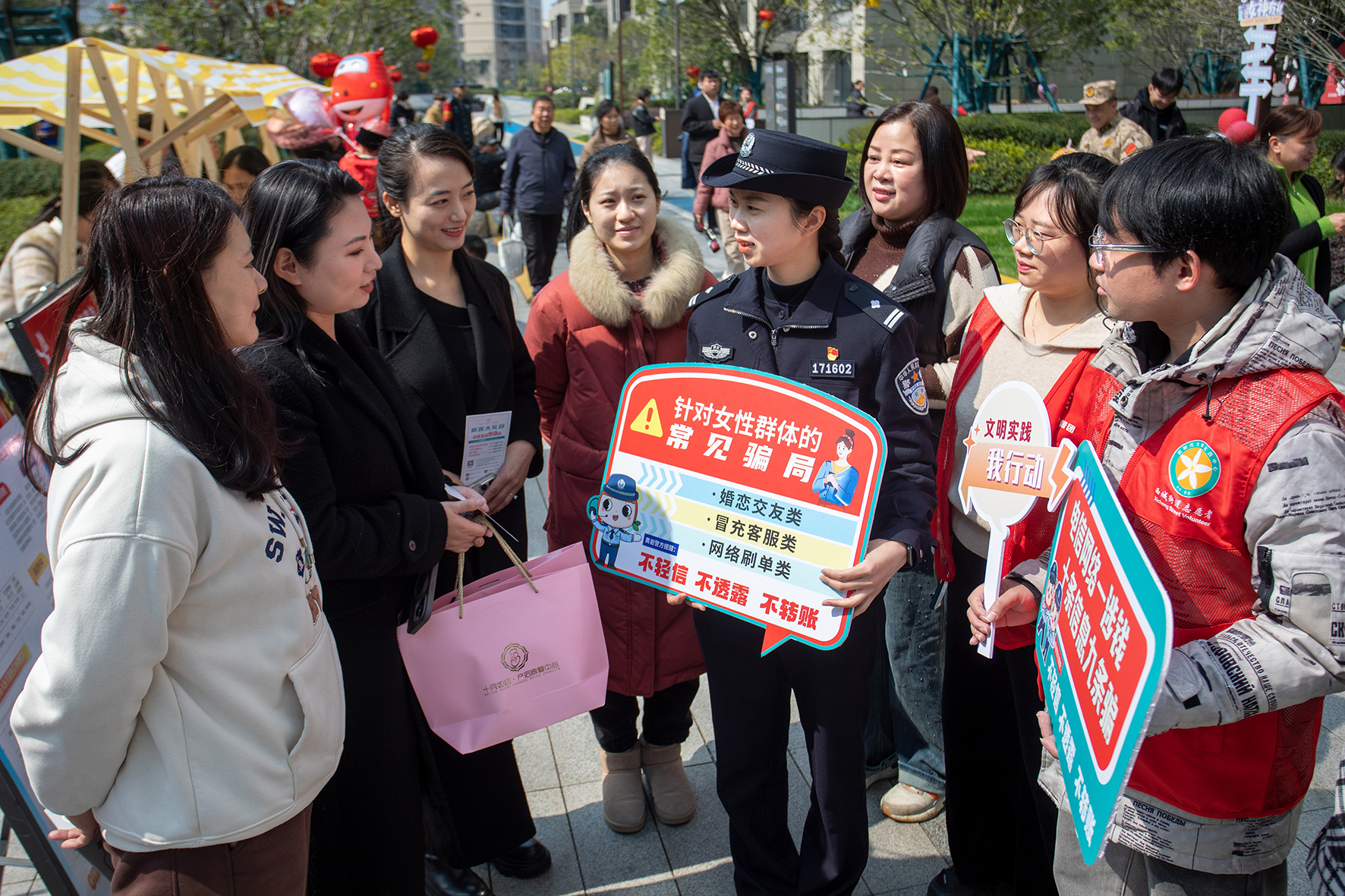 3月7日,浙江省臺(tái)州市公安局黃巖分局城西派出所女民警在迎“三八”活動(dòng)現(xiàn)場(chǎng)開展安全防范宣傳。