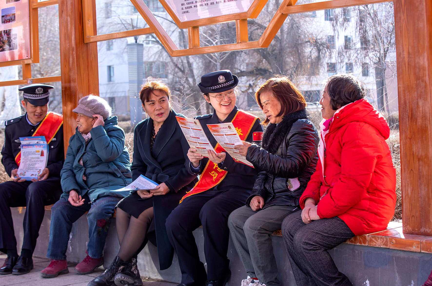 3月7日,湖北省荊門市公安局巡特警支隊(duì)蘇畈橋警務(wù)站女民警在沿河社區(qū),向居民普及婦女、兒童權(quán)益保護(hù)相關(guān)法律知識(shí)。