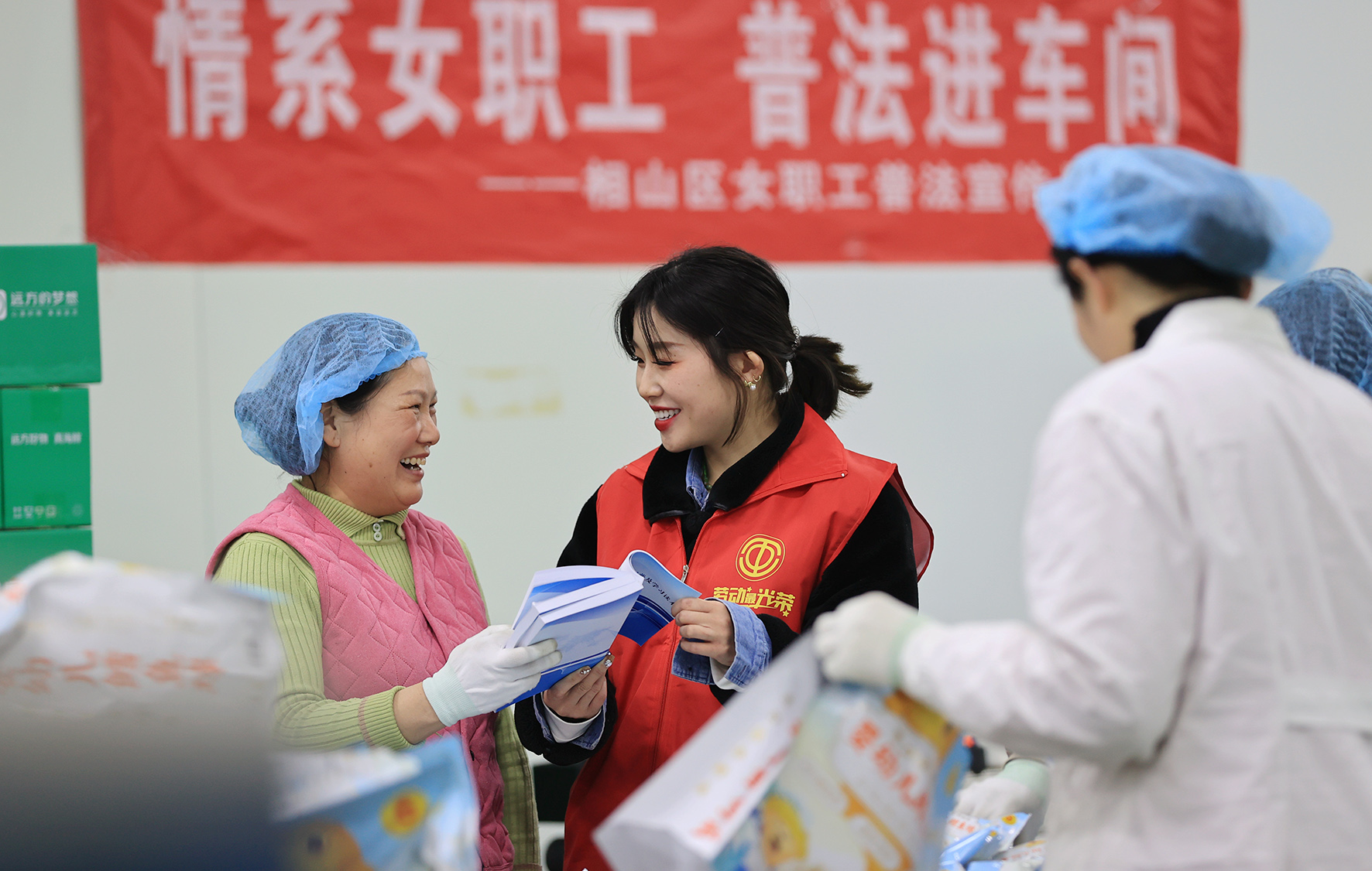 3月6日,安徽省淮北市相山區(qū)總工會(huì)普法志愿者在企業(yè)車間內(nèi),向女職工宣傳法律知識(shí)和企業(yè)安全生產(chǎn)知識(shí)。