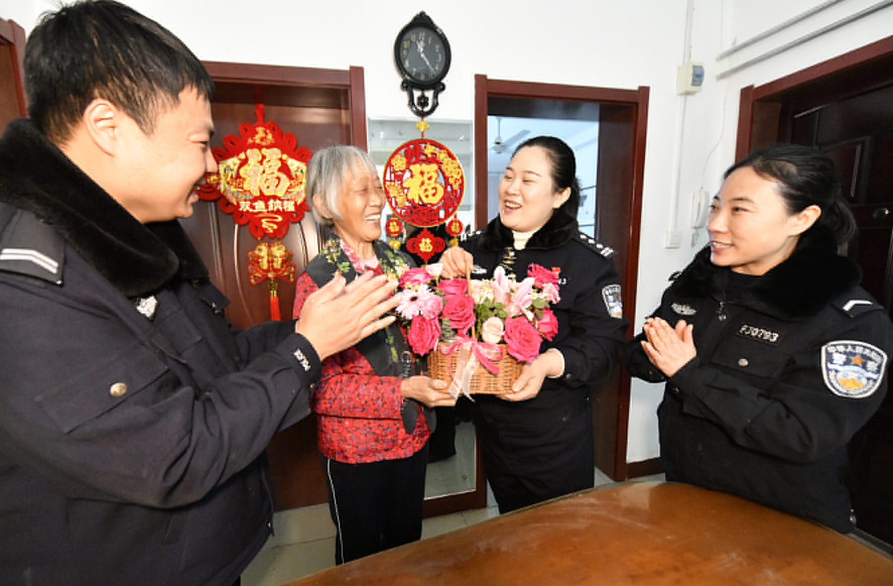 3月7日,河南省鄭州市公安局金水分局巡特警與人民路派出所的民輔警看望81歲的治安先進(jìn)個(gè)人吳大媽,并送上節(jié)日的問(wèn)候。