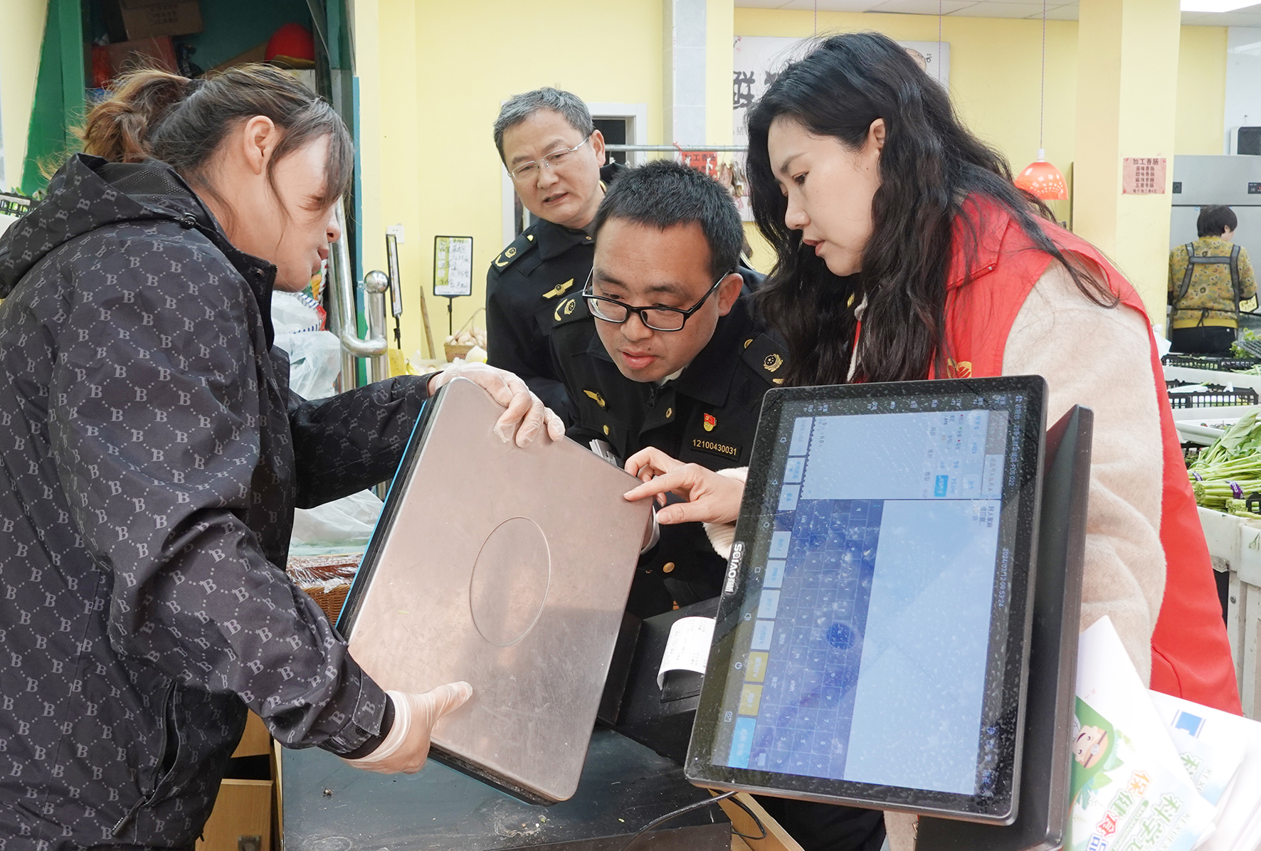 圖為執(zhí)法人員計(jì)量稱重器具進(jìn)行核查。