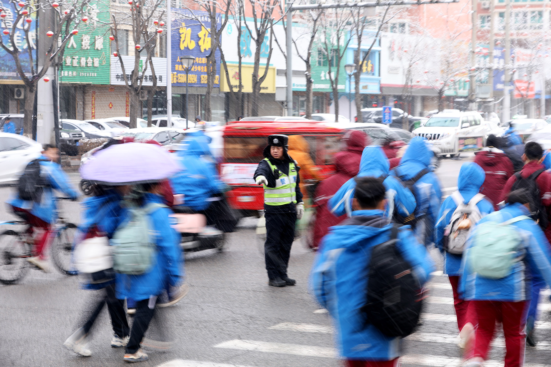 3月19日,遼寧省阜新市突降小雪。阜新市公安局交通警察支隊細河大隊民輔警頂風(fēng)冒雪,站好“護學(xué)崗”。