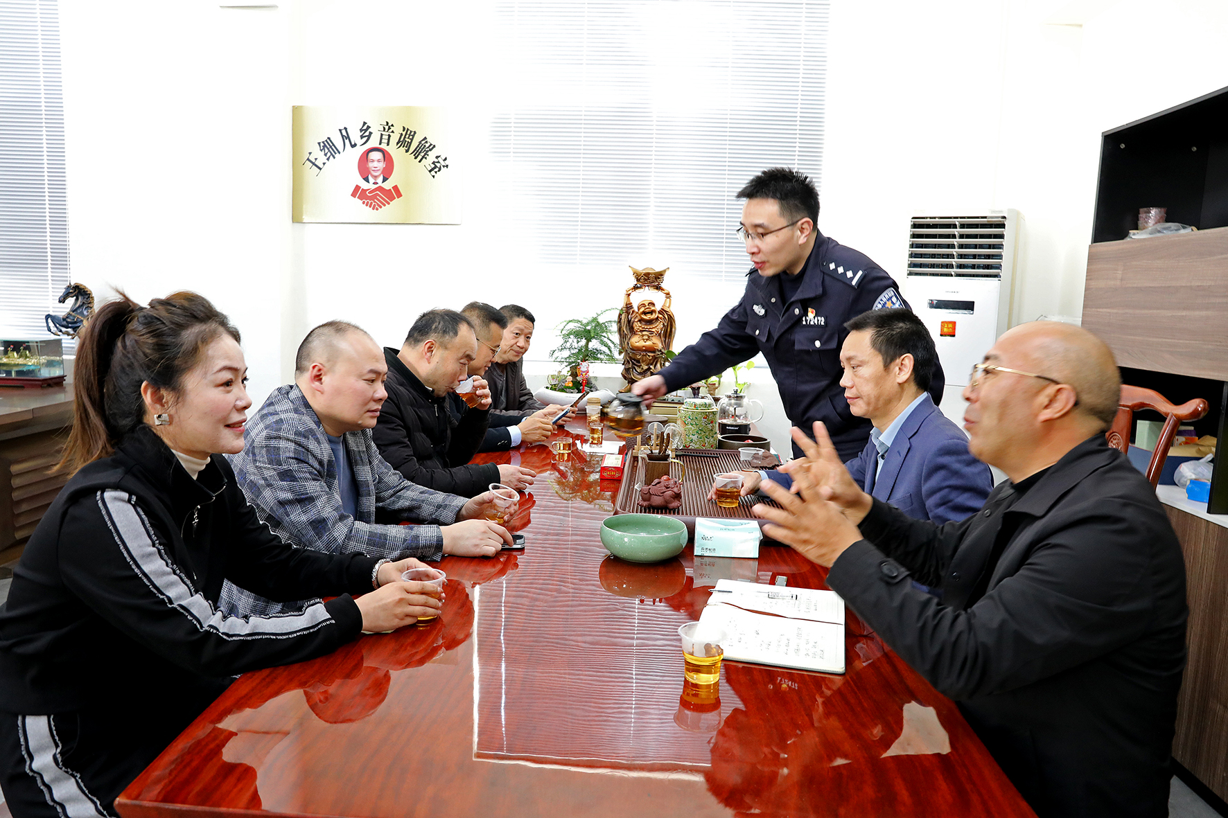 圖為3月19日,以王細(xì)凡個(gè)人命名的湖北籍鄉(xiāng)音調(diào)解室邀請(qǐng)杜橋派出所社區(qū)警務(wù)隊(duì)民警和專職調(diào)解員為“鄉(xiāng)音鄉(xiāng)情”調(diào)解員講解工作技巧。