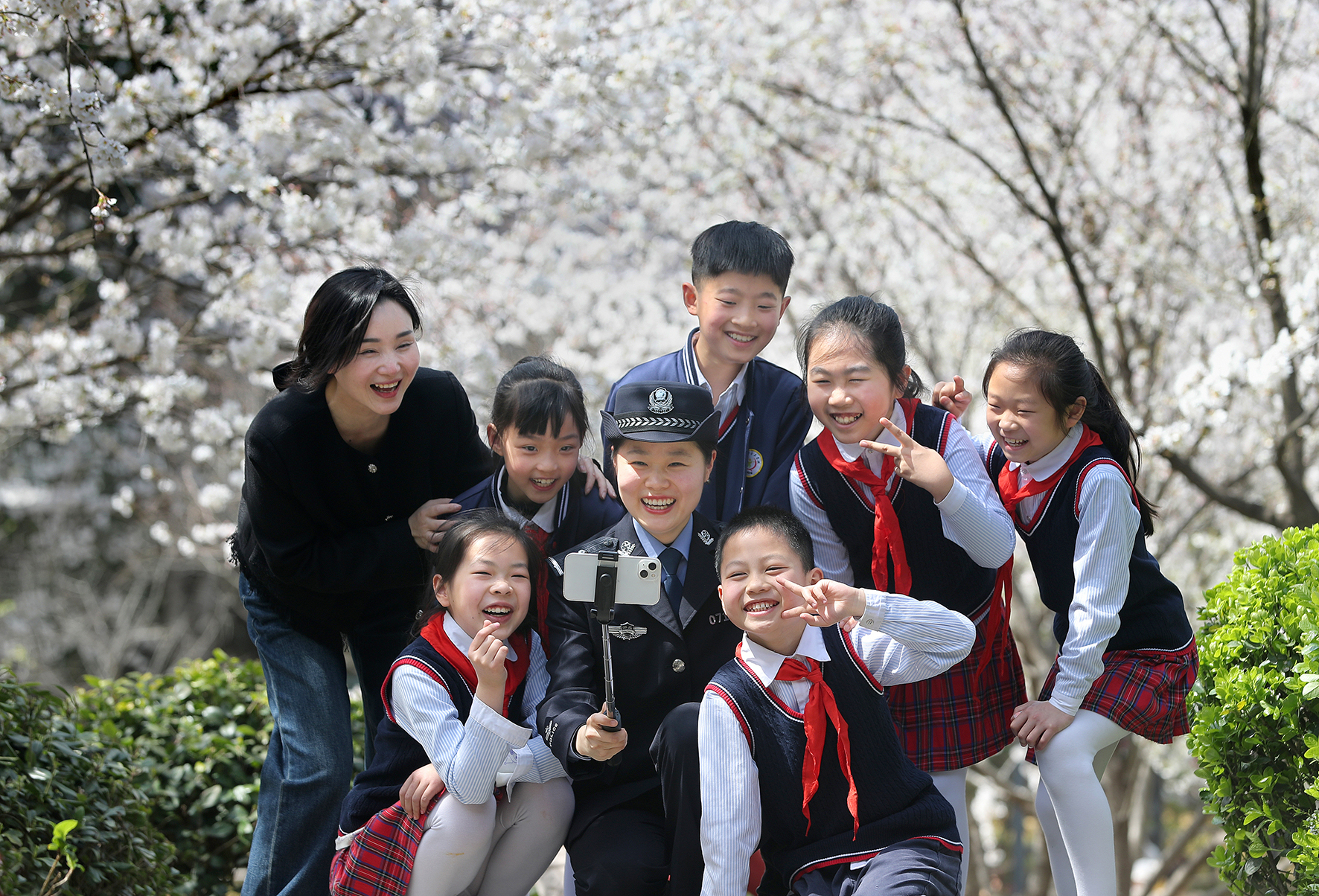 春分時節(jié),賞花踏青。3月20日,在湖北省荊門市象山景區(qū),荊門市公安局東寶分局泉口派出所民警帶著留守兒童踏春郊游,感受春天的溫暖氣息。