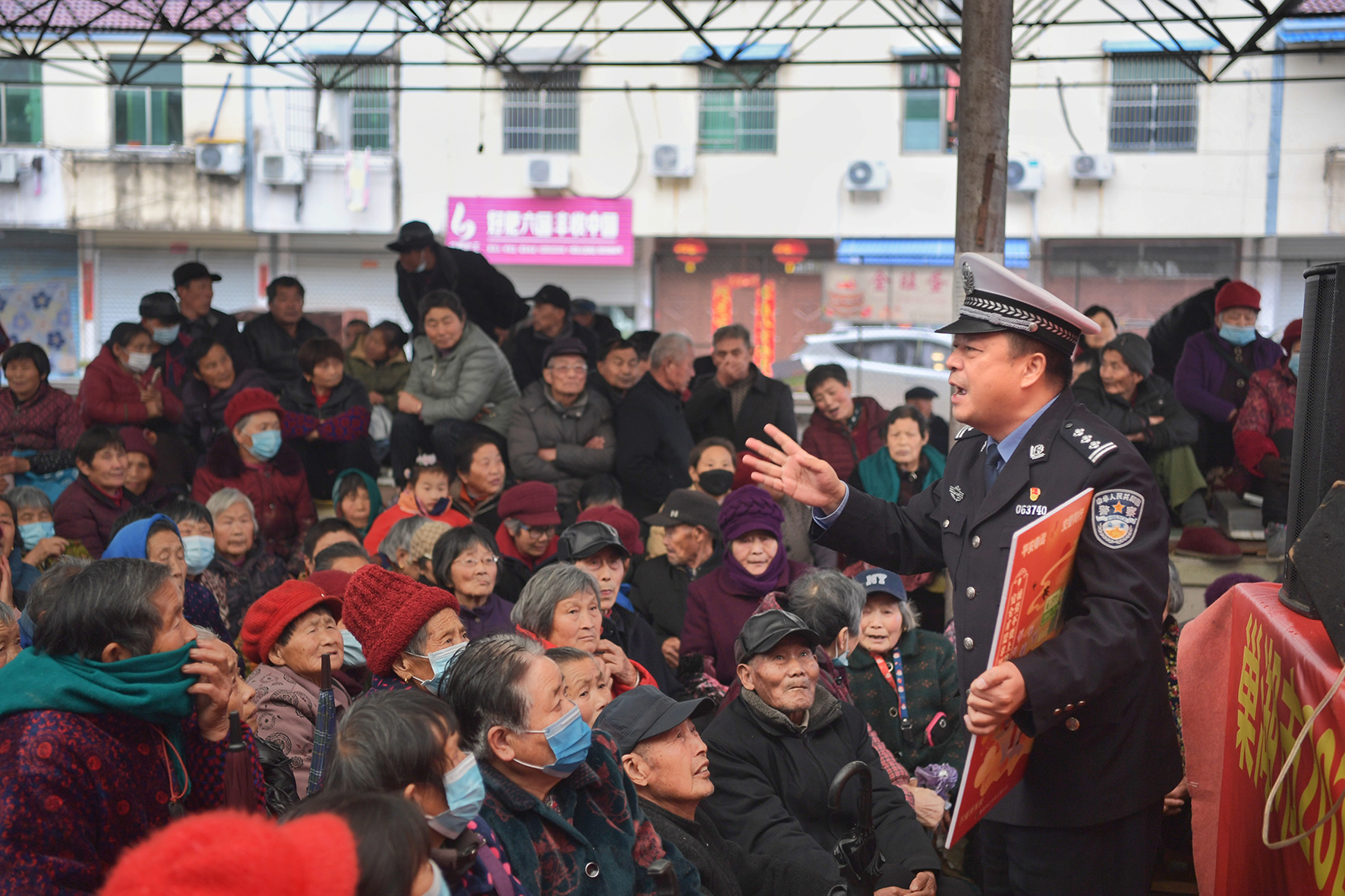 3月27日,安徽省巢湖市公安局交警大隊(duì)民輔警利用送戲進(jìn)村的機(jī)會(huì),為看戲群眾講解農(nóng)村道路交通安全常識(shí)。