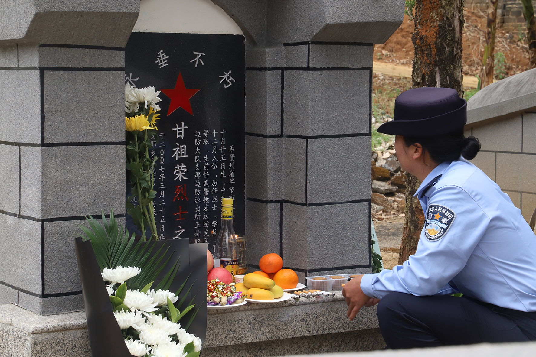 4月1日,云南出入境邊防檢查總站德宏邊境管理支隊(duì)?wèi)衾吘撑沙鏊窬视袂賮?lái)到烈士哥哥甘祖榮墓前進(jìn)行祭奠。