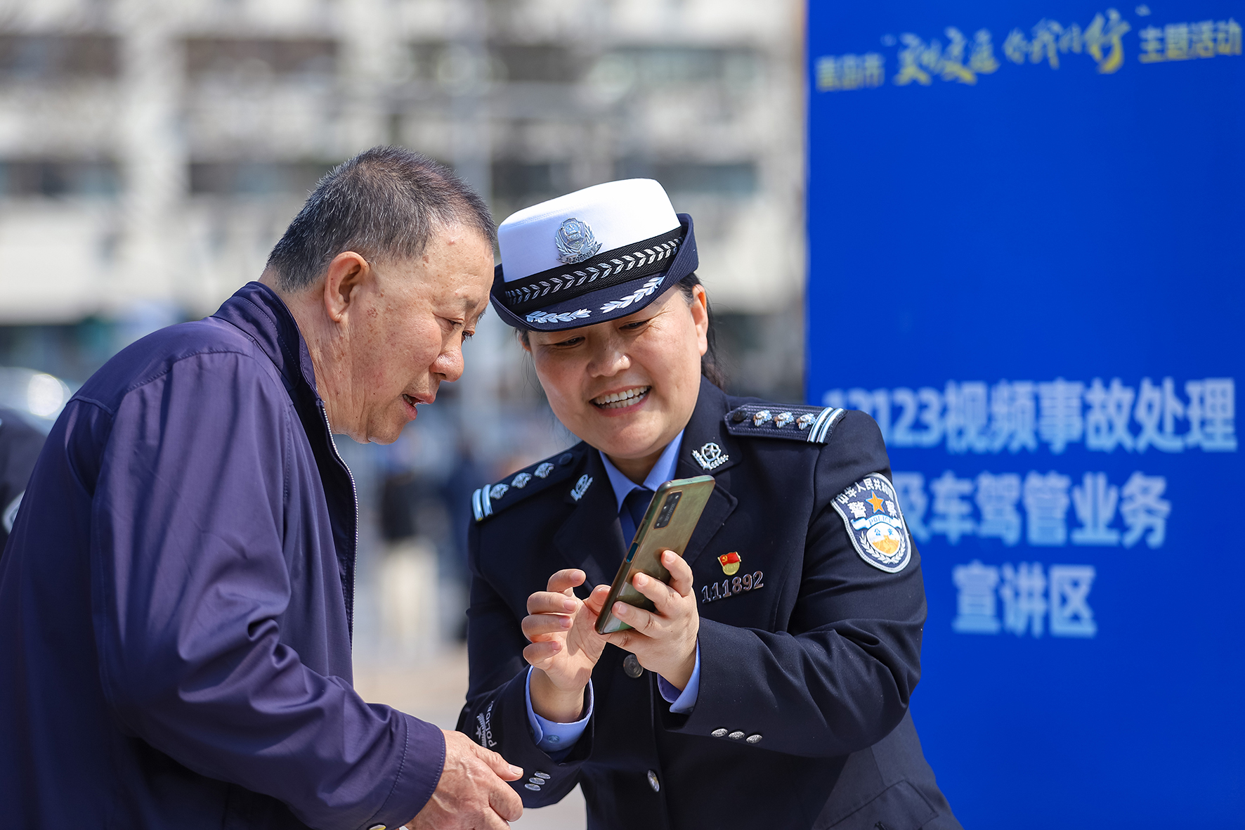 圖為民警向市民講解“交管12123”App事故視頻快處操作流程。