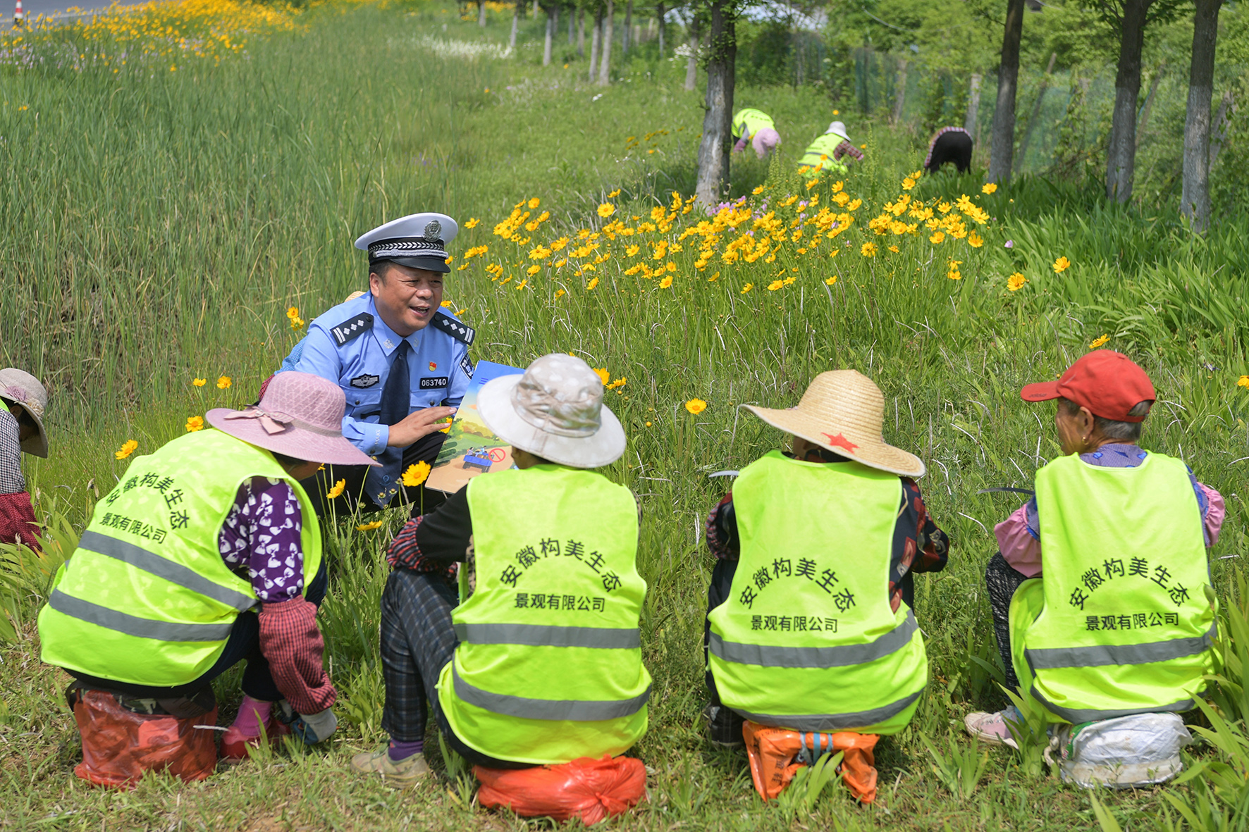 5月8日,安徽省巢湖市公安局交警大隊(duì)民警對路邊作業(yè)的綠化工人進(jìn)行交通安全宣傳。