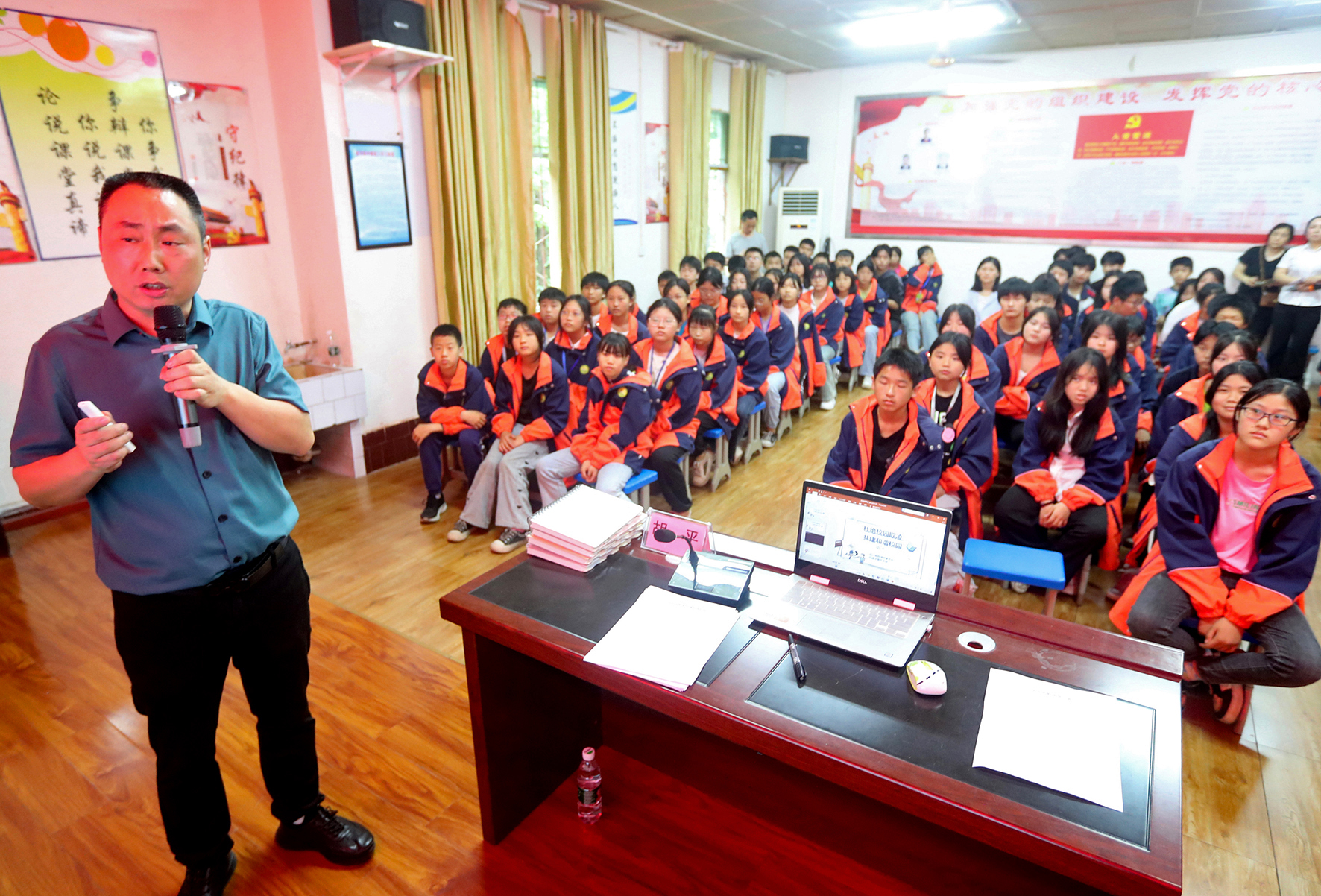 圖為5月9日,四川省華鎣市的律師志愿者在雙河四中向?qū)W生宣講反欺凌相關(guān)法治知識(shí)。