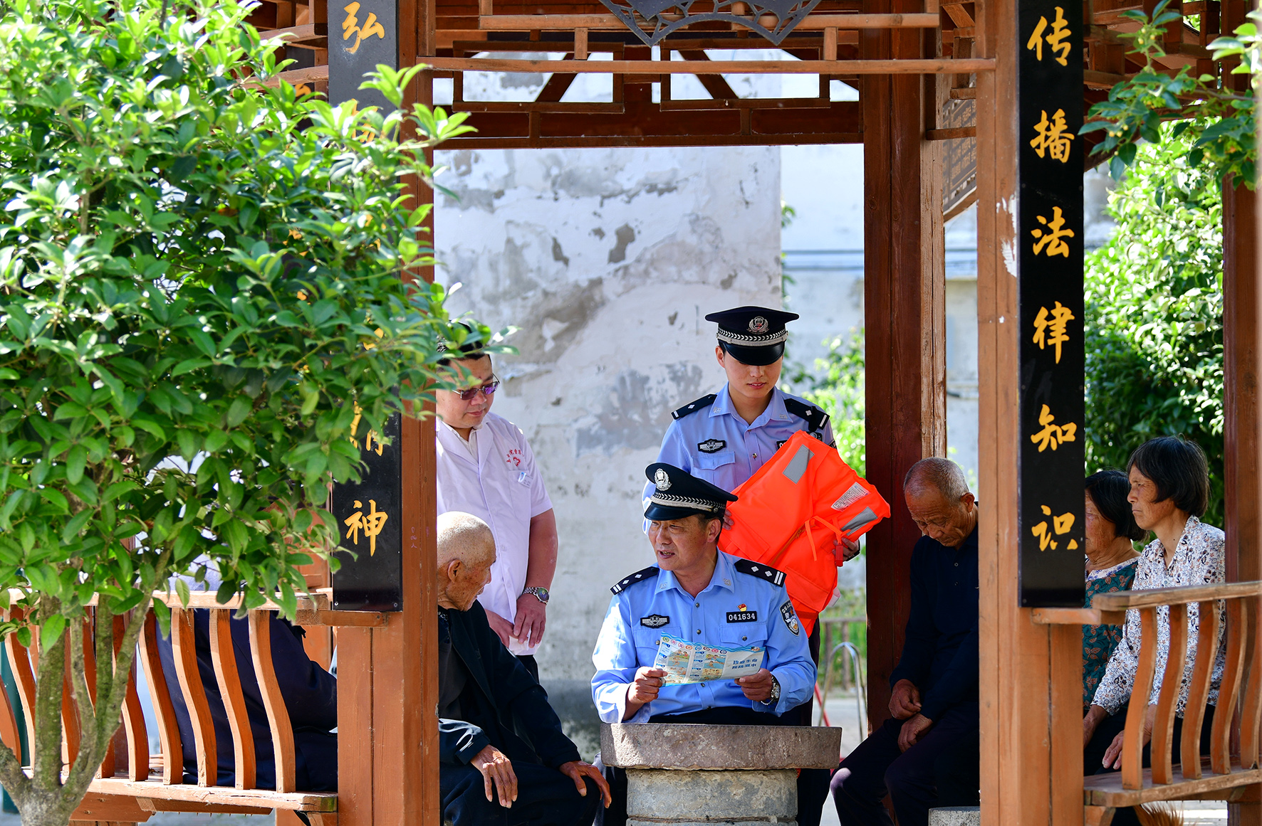 5月10日,安徽省阜南縣公安局安崗派出所民警在曹集鎮(zhèn)西田陂莊臺(tái)的普法宣講亭里向村民們宣講防范養(yǎng)老詐騙、防溺水等知識(shí)。