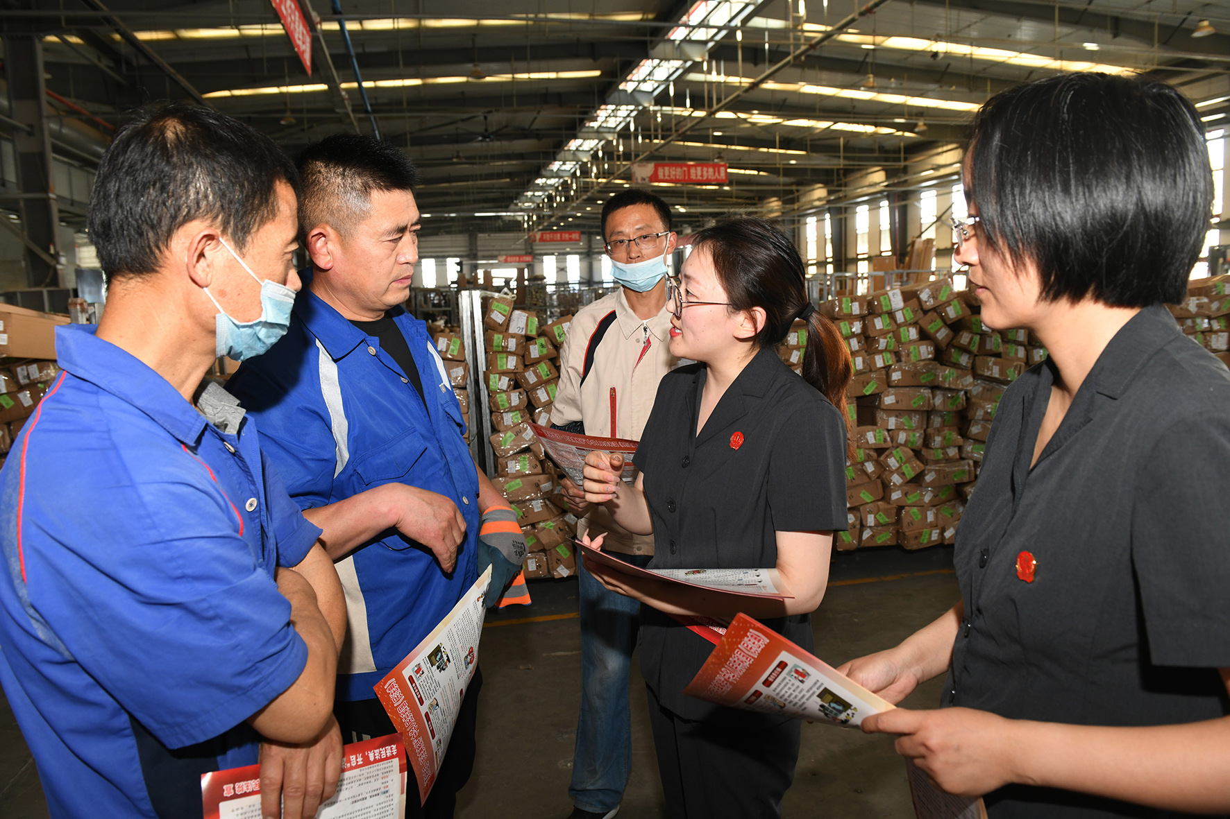 5月14日,法官在安徽省宿州市埇橋區(qū)一家民營企業(yè)生產(chǎn)車間解答員工涉法事宜。