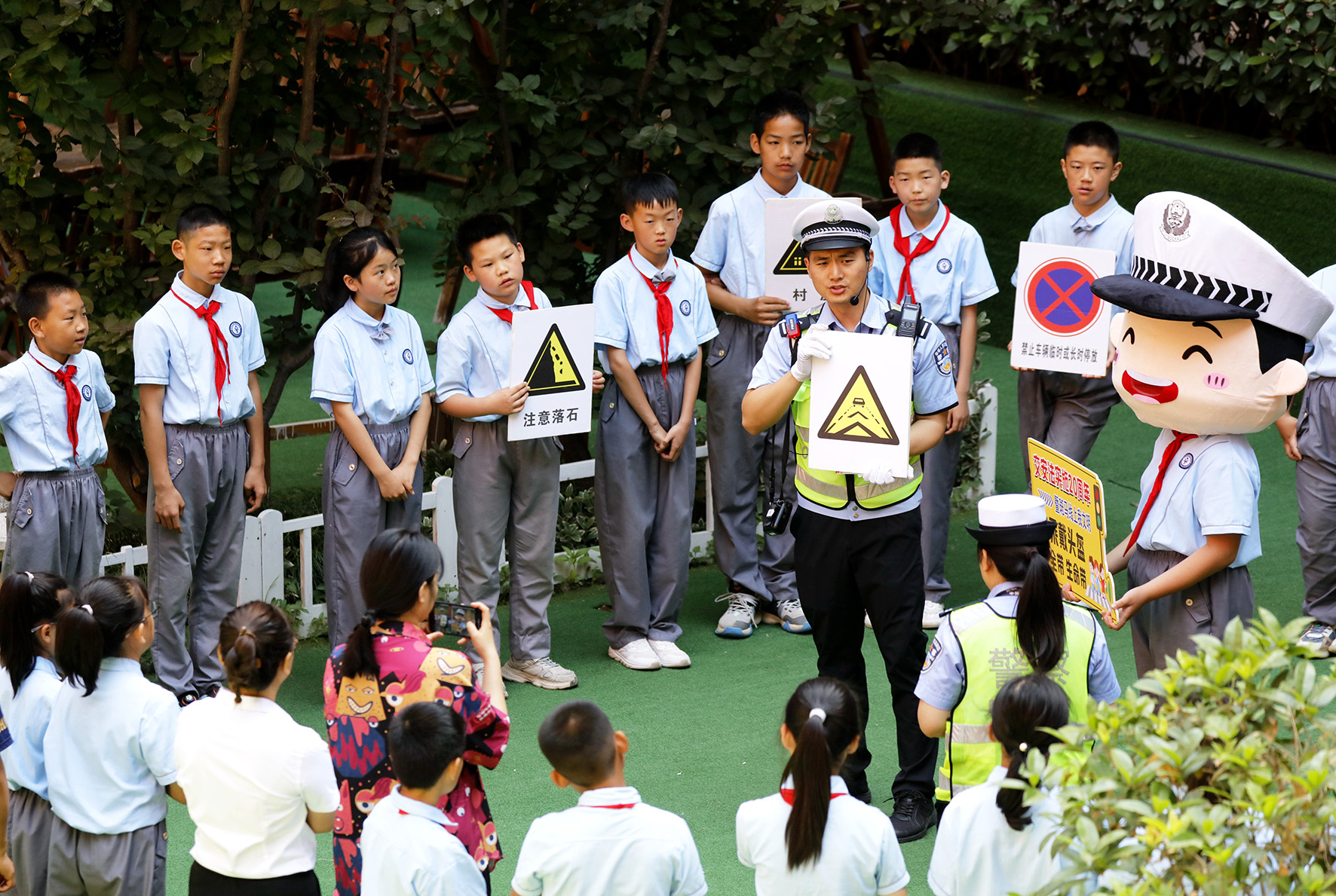 在交通安全法實施20周年之際,5月16日,陜西省渭南市公安局交警支隊臨渭大隊民警與卡通人偶給小學(xué)生普及交通安全知識。