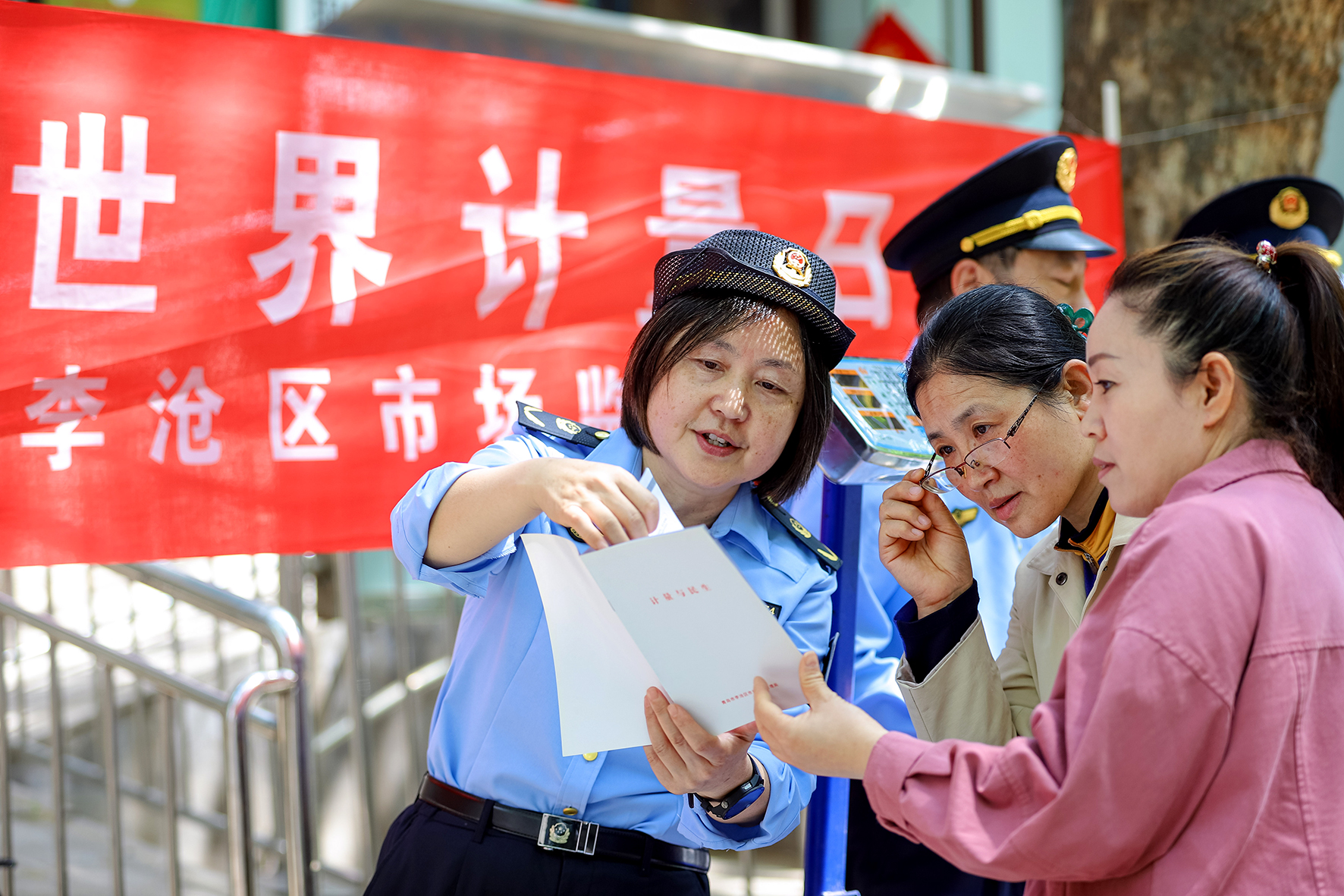 圖為5月17日,執(zhí)法人員在李村街道向陽路社區(qū)向市民介紹計(jì)量知識(shí)。