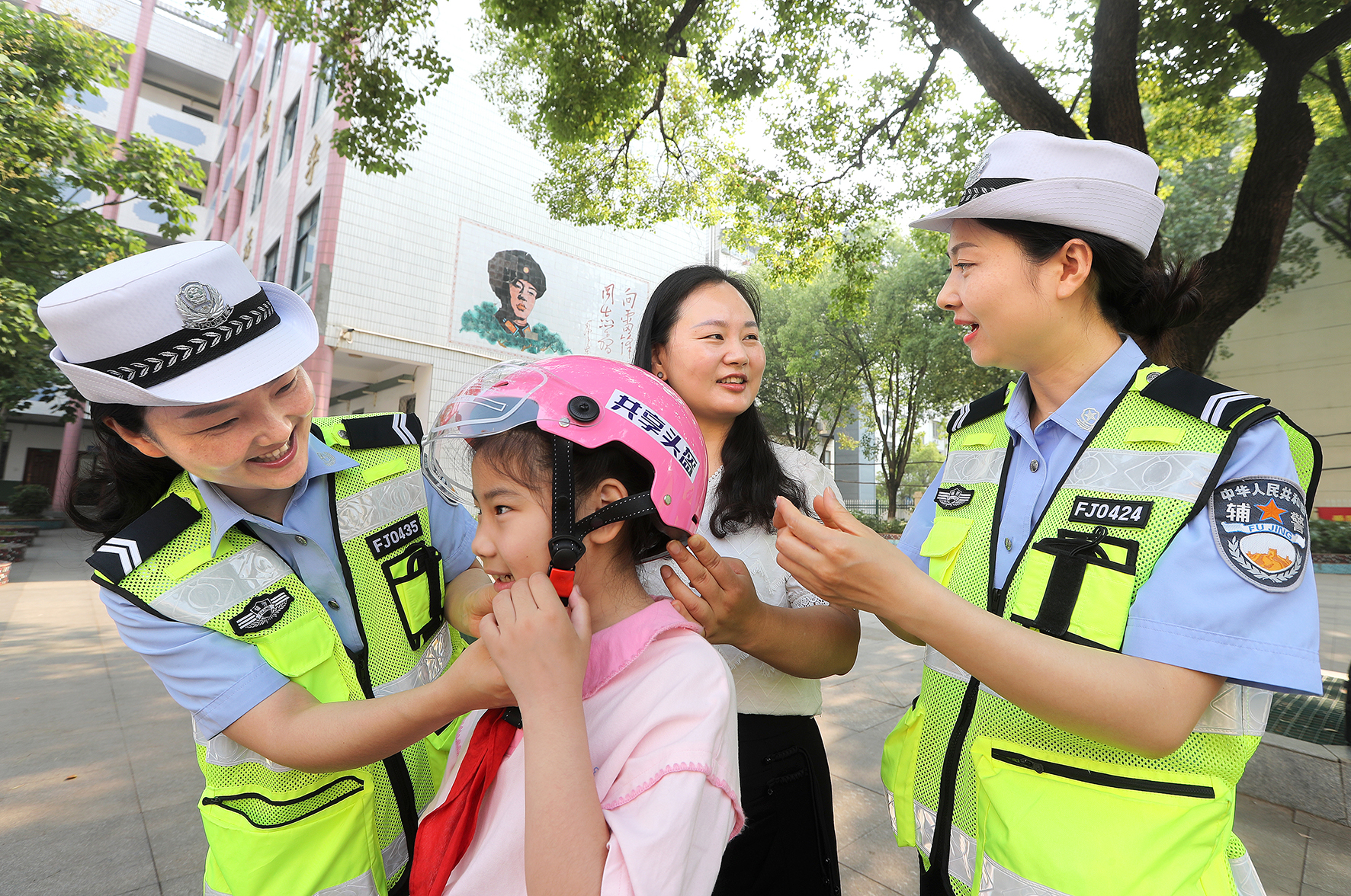 5月23日,湖北省荊門市公安局交警支隊民輔警在竹園小學(xué),向師生及家長宣傳“共享頭盔”的使用。
