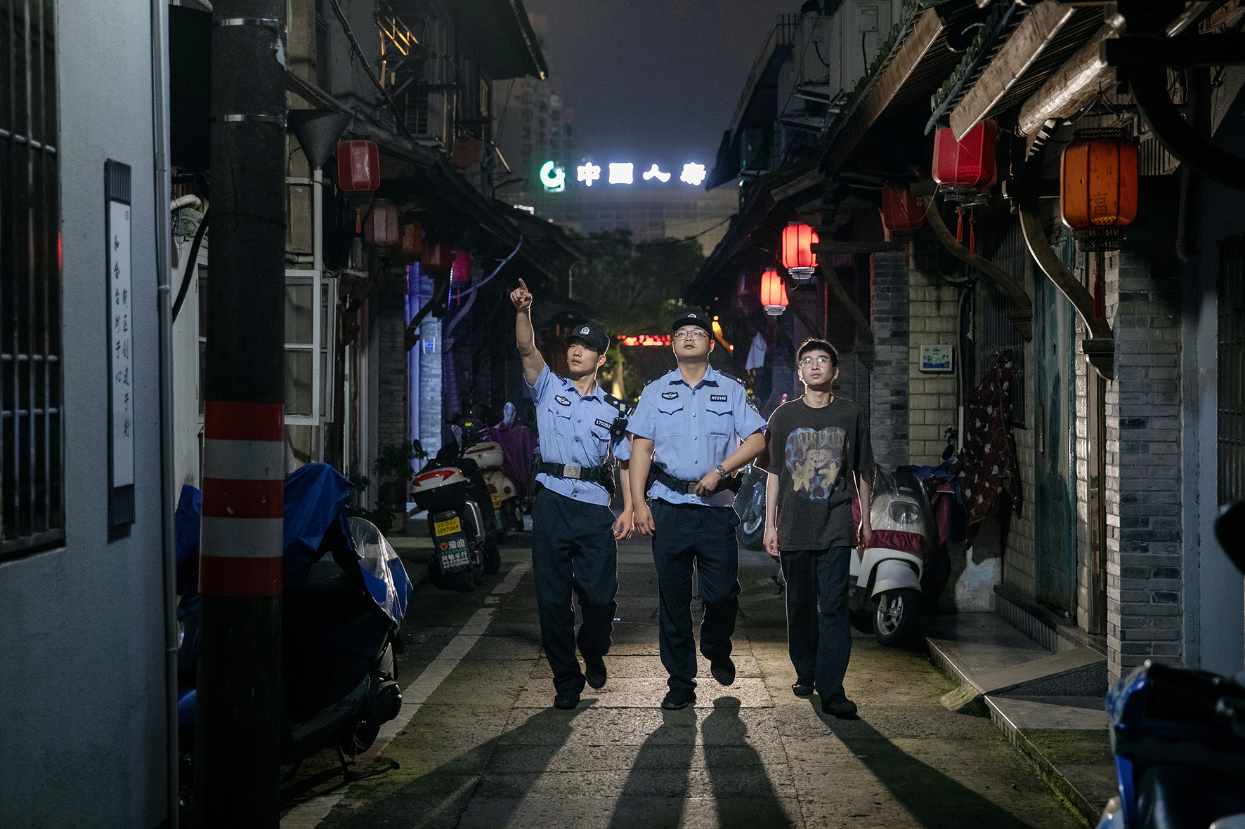 圖為5月23日深夜,派出所民警和巡防志愿者一起,在西城橋上街步行巡邏。