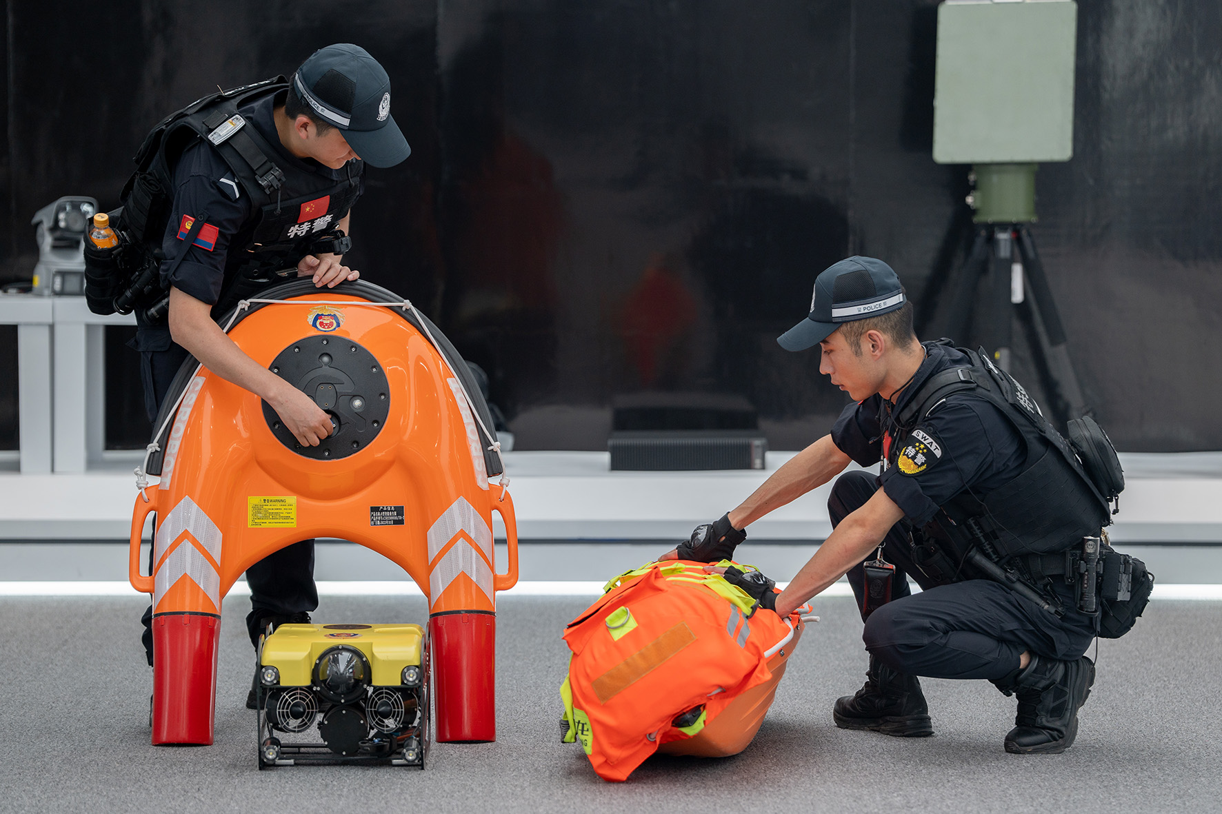 圖三:綿陽市公安局科新區(qū)分局民警練習(xí)操作水面救援機(jī)器人。