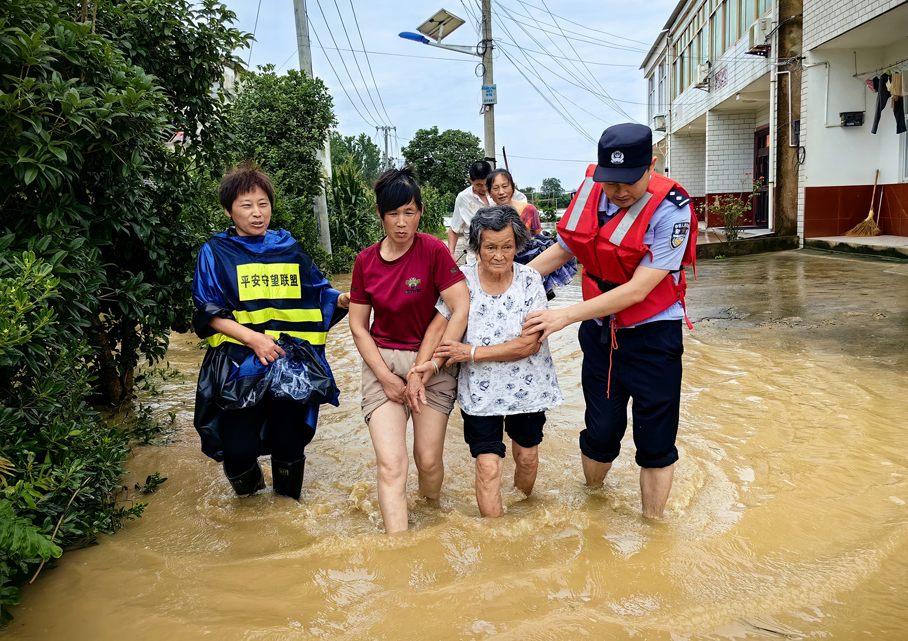 7月2日,安徽省舒城縣公安局百神廟派出所民警聯(lián)合應(yīng)急救援部門、平安守望聯(lián)盟隊員一起有序地引導群眾離開積水地帶。連日來,持續(xù)強降雨天氣侵襲舒城,致使部分低洼村莊受淹,舒城縣公安局以“汛”為令,民警輔警沖鋒在前,堅守搶險一線。