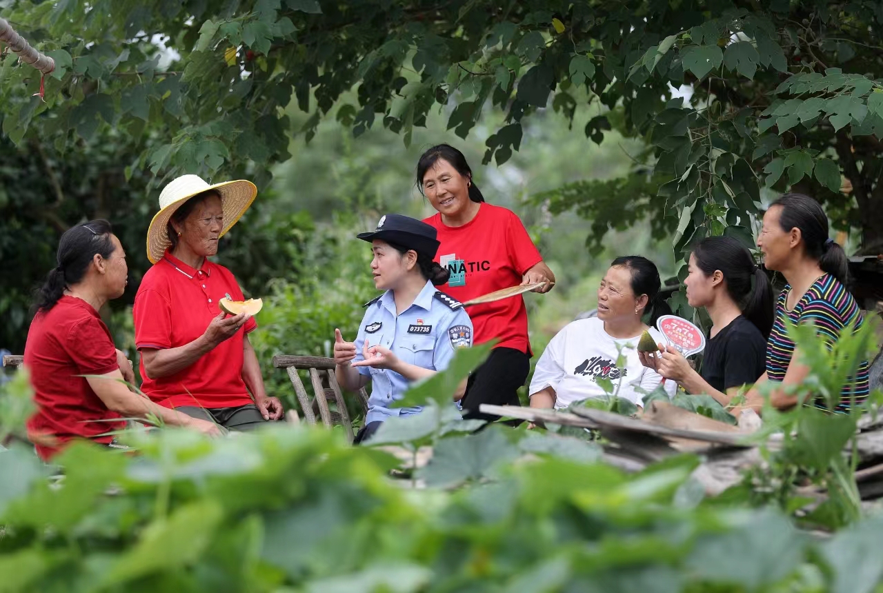 7月9日,在湖北省沙洋縣曾集鎮(zhèn)龔廟村,沙洋縣公安局女警向村民進行未成年人防溺水、反詐、禁毒普法宣傳,對空巢老人和婦女兒童開展巾幗志愿服務。
