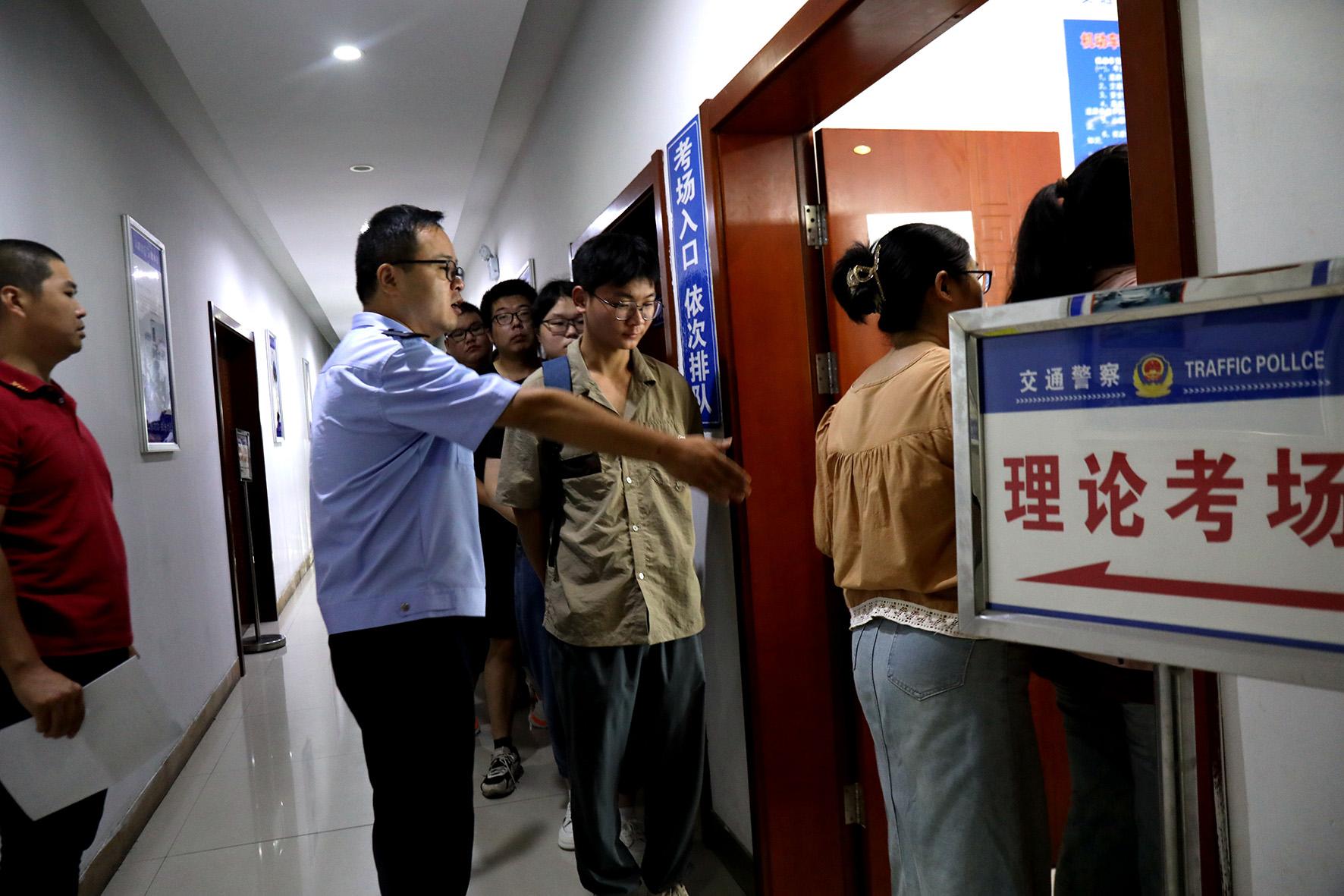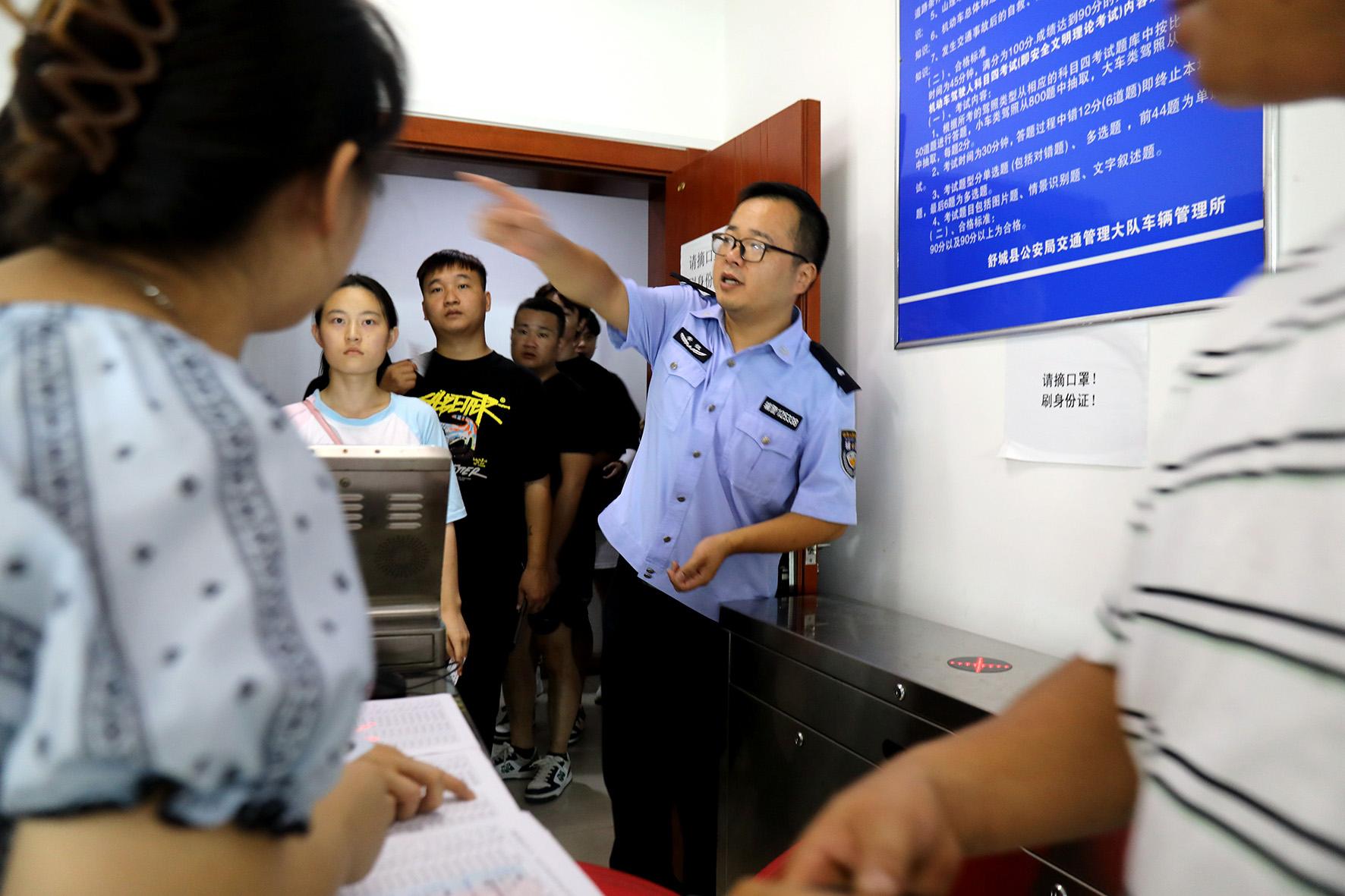 8月1日,安徽省舒城縣公安局交管大隊(duì)車管所民警輔警在科目一考場(chǎng)為參加考試的考生提供服務(wù)。暑假期間,報(bào)名駕考人員大部分為大學(xué)生及高中畢業(yè)生,車管所通過(guò)增加工作時(shí)間、考試場(chǎng)次、增派考試員等方式,全力應(yīng)對(duì)暑期“駕考熱”。