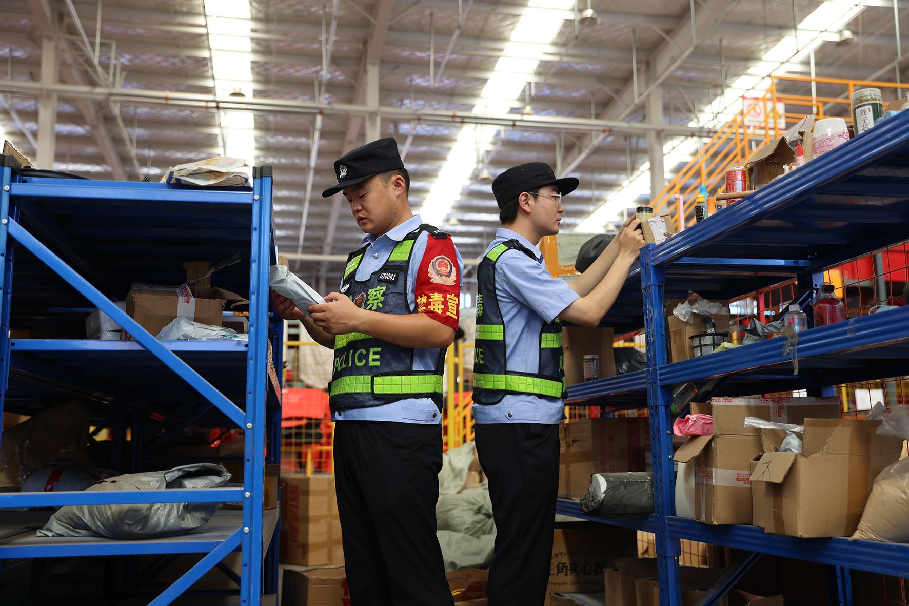 圖為民警對物流寄遞物品進行嚴(yán)檢細查。