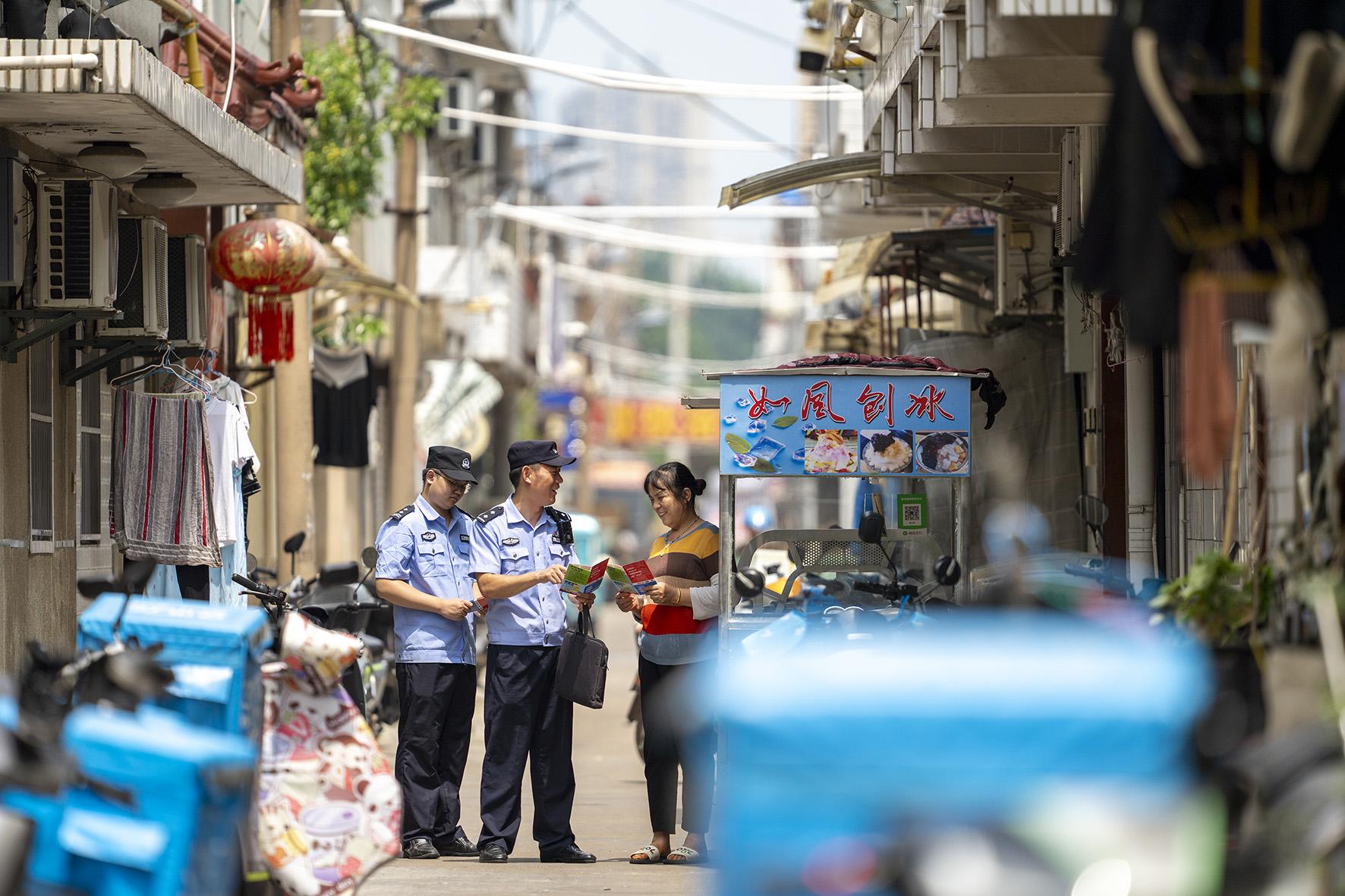 8月5日,在江蘇省鹽城市亭湖區(qū)萬戶新村,鹽城市公安局亭湖分局五星派出所社區(qū)民警冒著高溫在轄區(qū)走訪。