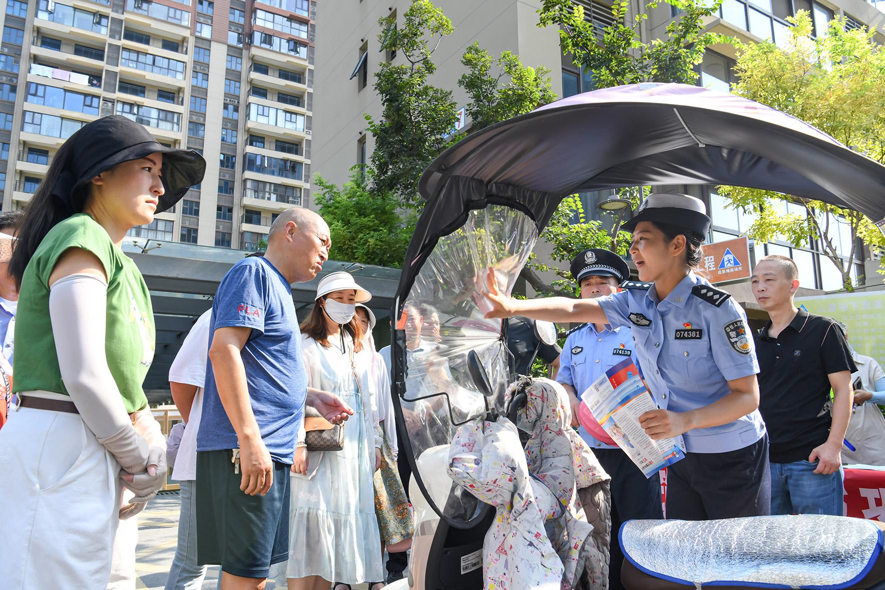 圖為民警向群眾講解電動(dòng)車遮陽(yáng)棚的危害。
