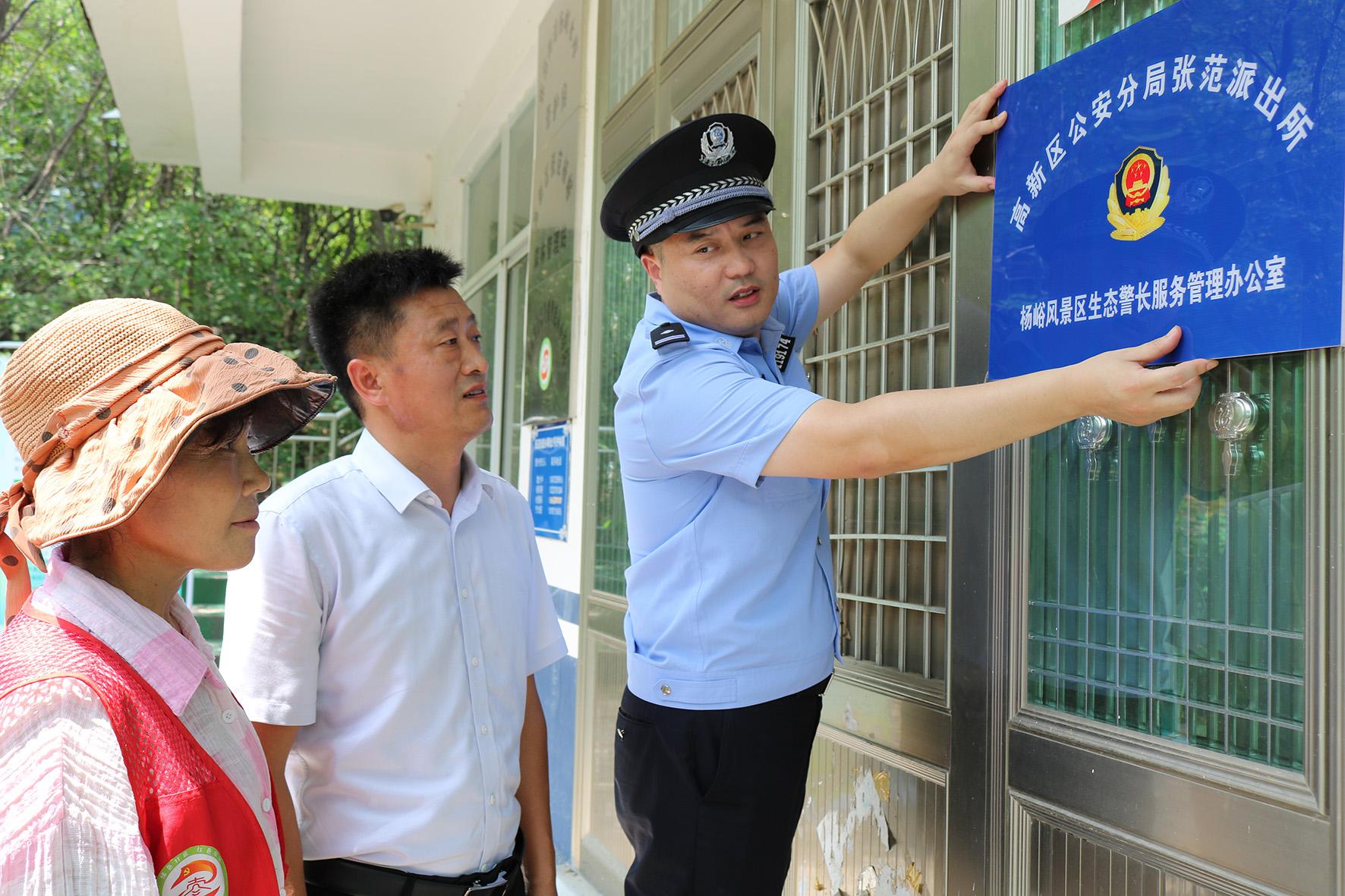 8月9日,在山東省棗莊市高新區(qū)楊峪風(fēng)景區(qū),生態(tài)警長掛牌上崗。今年以來,棗莊市公安局高新區(qū)分局堅定踐行“綠水青山就是金山銀山”理念,主動將公安工作融入綠色崛起、融合振興的高質(zhì)量發(fā)展大局,全面實施“生態(tài)警務(wù)”機制,通過設(shè)立“生態(tài)警務(wù)室”,構(gòu)建生態(tài)警長+治安員+消防員+護林員+網(wǎng)格員+宣傳員“一長五員”生態(tài)警務(wù)模式,以“警察藍(lán)”護航“生態(tài)綠”,守護綠水青山。
