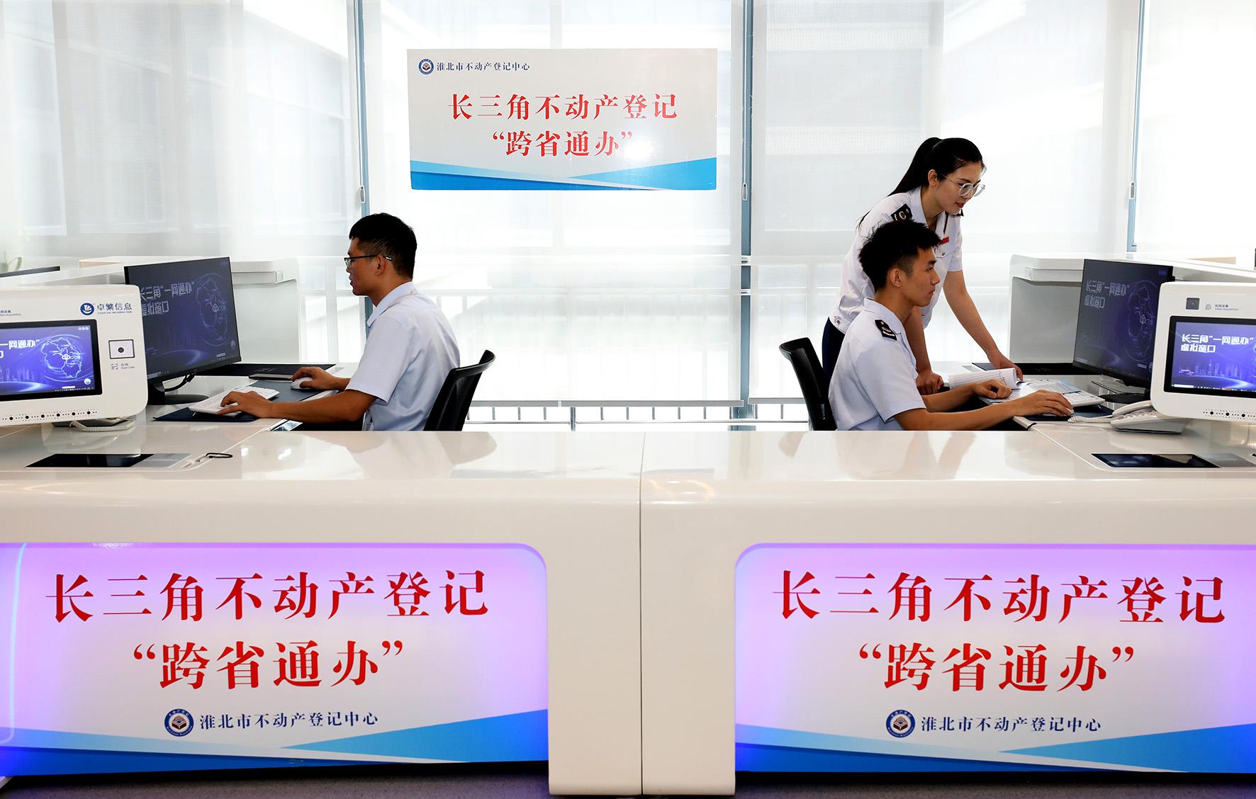 9月5日,安徽省淮北市政務(wù)服務(wù)中心稅務(wù)和不動(dòng)產(chǎn)登記部門工作人員,利用長(zhǎng)三角一體化跨省通辦政務(wù)“虛擬窗口”,為異地群眾遠(yuǎn)程辦理不動(dòng)產(chǎn)登記業(yè)務(wù)。