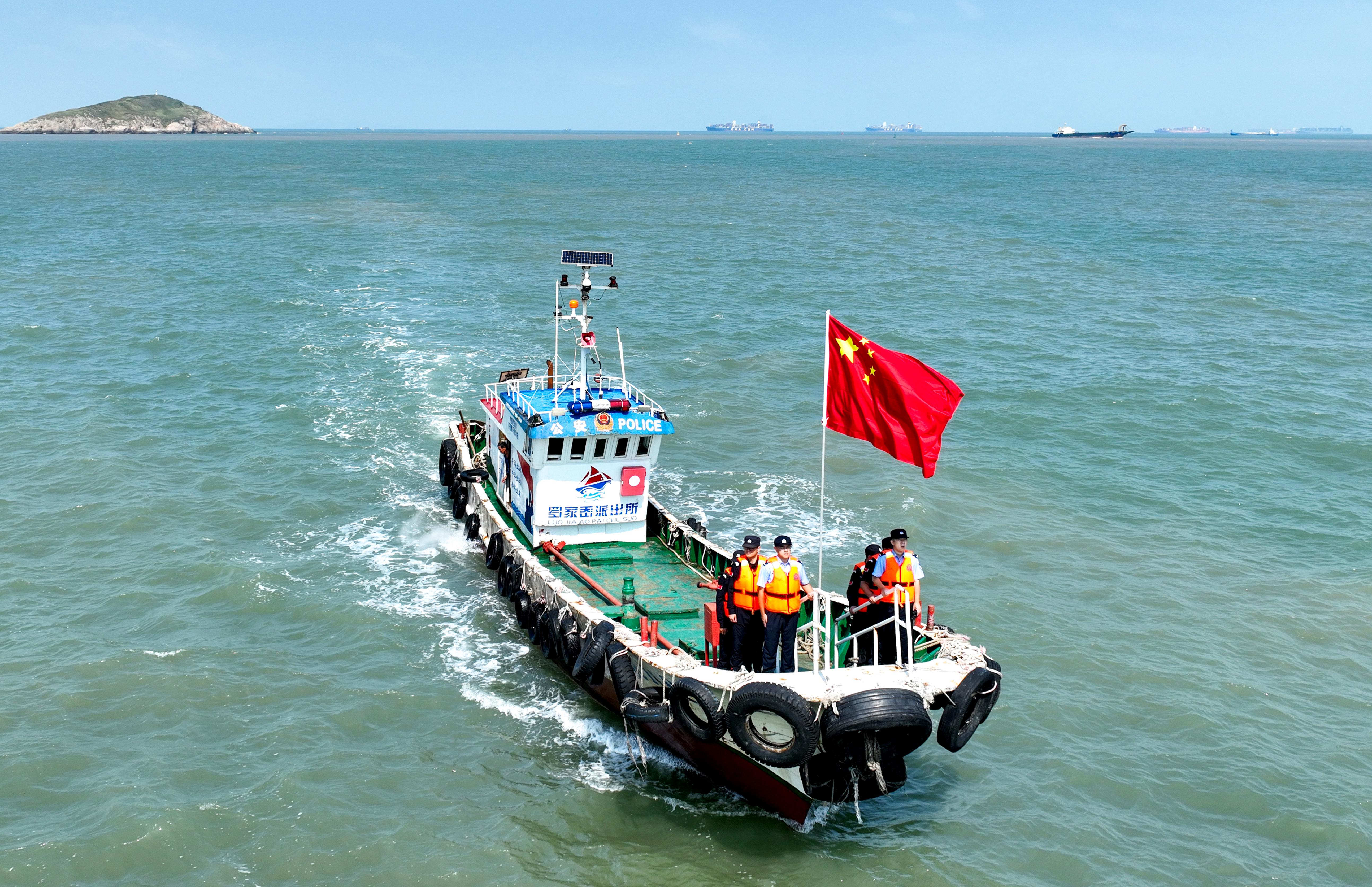 10月1日,浙江省舟山市岱山縣公安局羅家岙派出所民警輔警堅(jiān)守崗位,乘坐“紅帆110”船只開展“祝福祖國 守護(hù)平安”主題海上巡查行動(dòng)。
