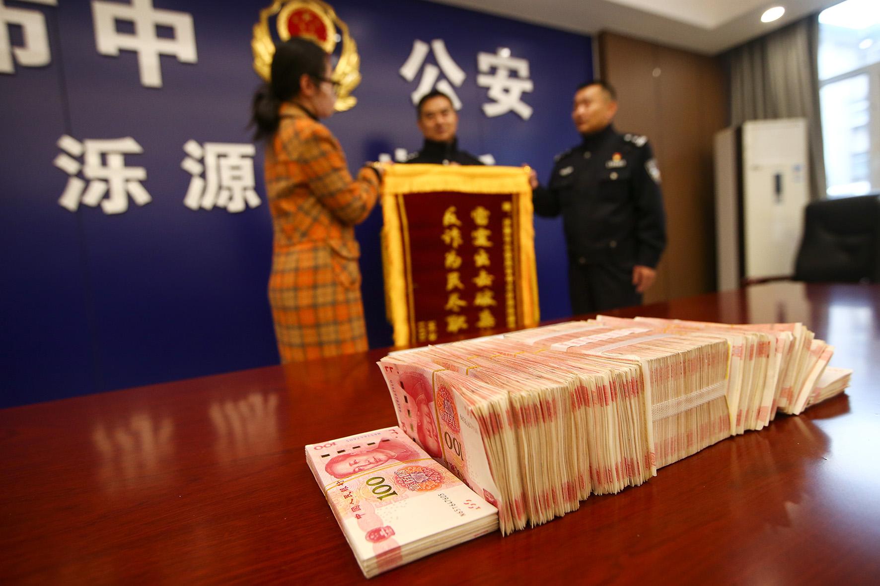 10月21日,在山東省濟(jì)南市公安局市中區(qū)分局濼源派出所,來(lái)自安徽的受害人李女士領(lǐng)取了被騙的24萬(wàn)現(xiàn)金。