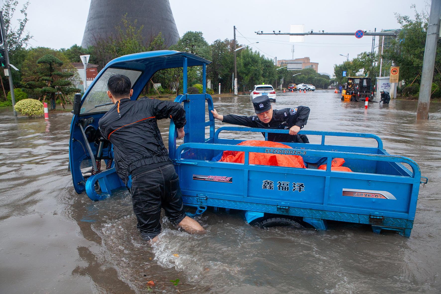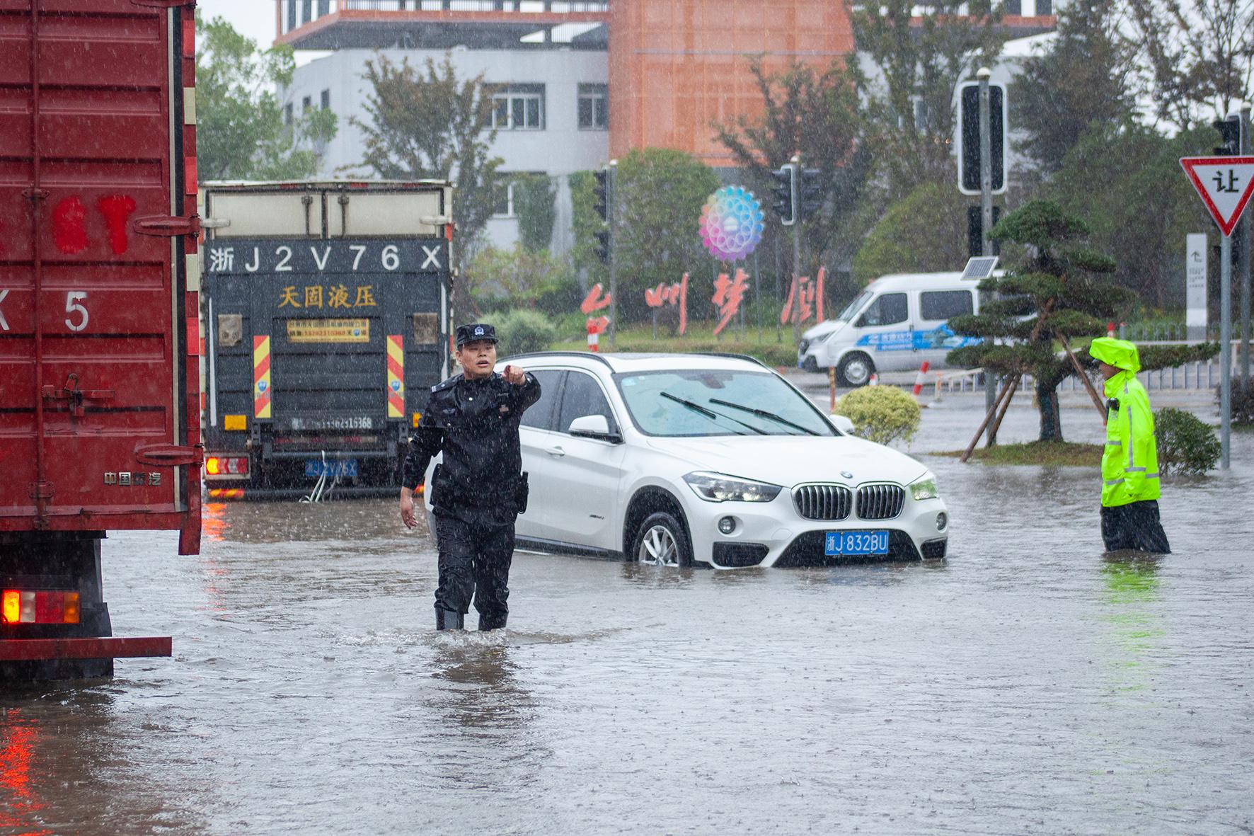11月1日,臺風“康妮”帶來的暴雨使浙江省臺州市黃巖區(qū)部分路段積水嚴重。臺州市公安局黃巖分局全力應(yīng)對,做好救援車輛、轉(zhuǎn)移群眾工作。