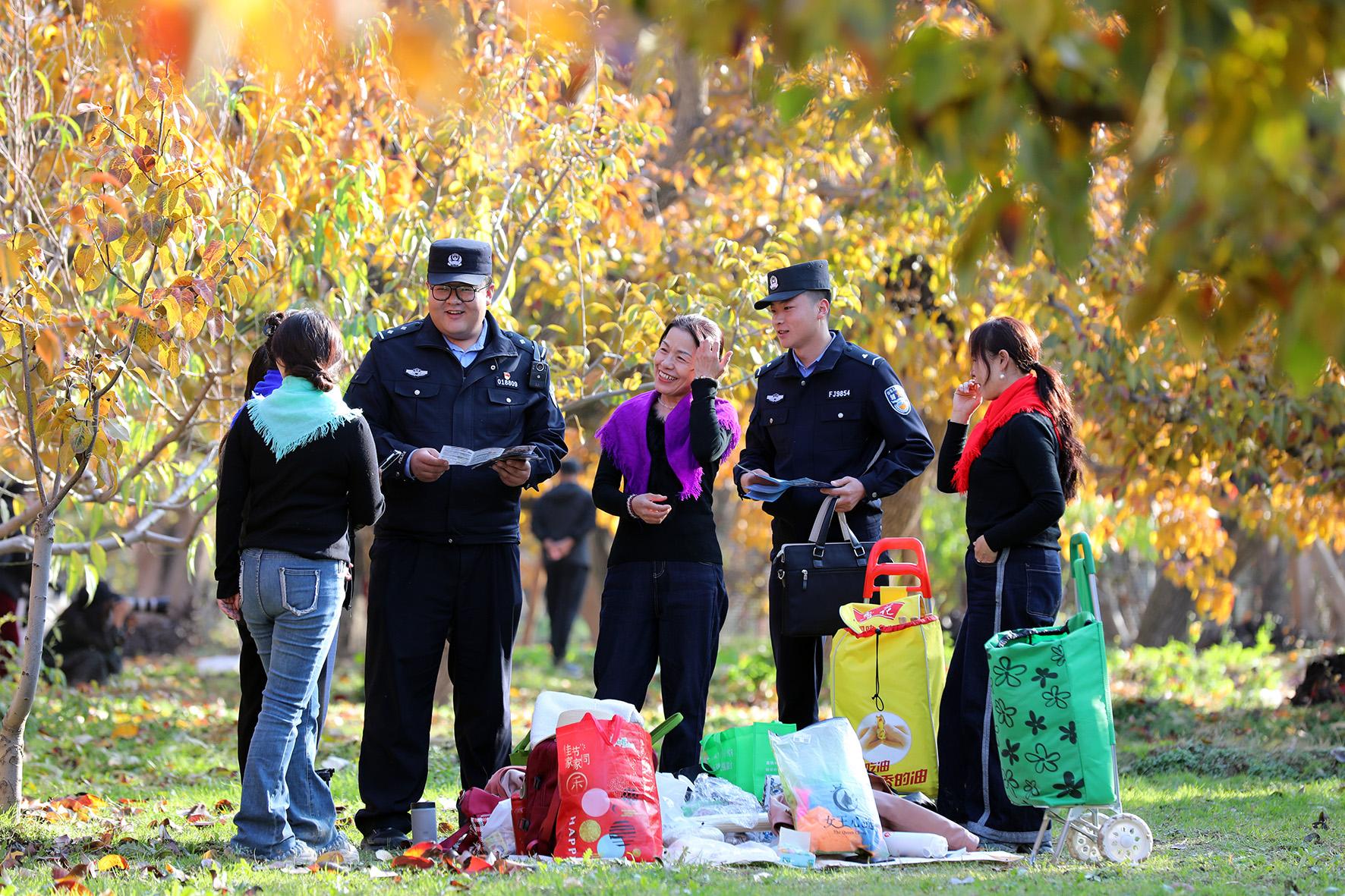 11月6日,甘肅省蘭州市皋蘭縣公安局什川派出所民警輔警走進梨園,向游客普及安全防范知識。