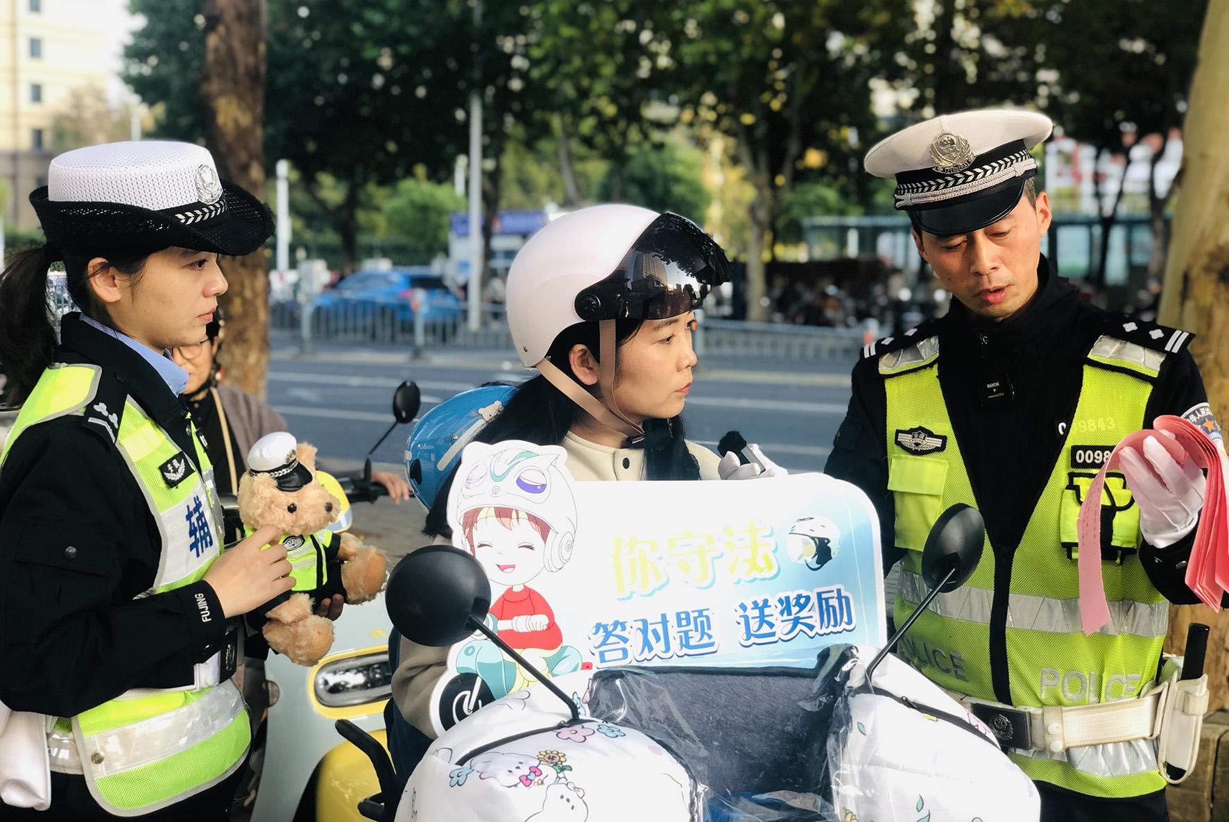 “您知道騎電動(dòng)車要戴安全頭盔嗎?”11月12日,安徽省蕪湖市公安局交警支隊(duì)鏡湖大隊(duì)民輔警來到轄區(qū)北塘小學(xué)向家長和小朋友們開展“答對題 送獎(jiǎng)勵(lì)”交通安全宣傳活動(dòng)。