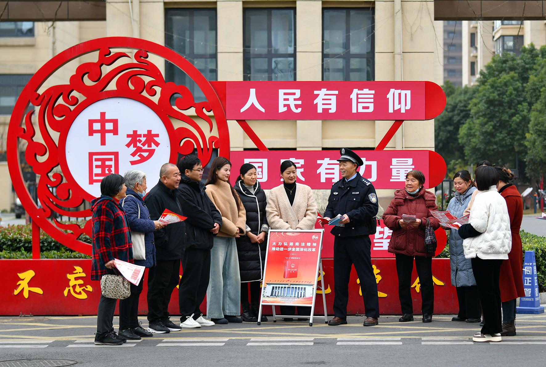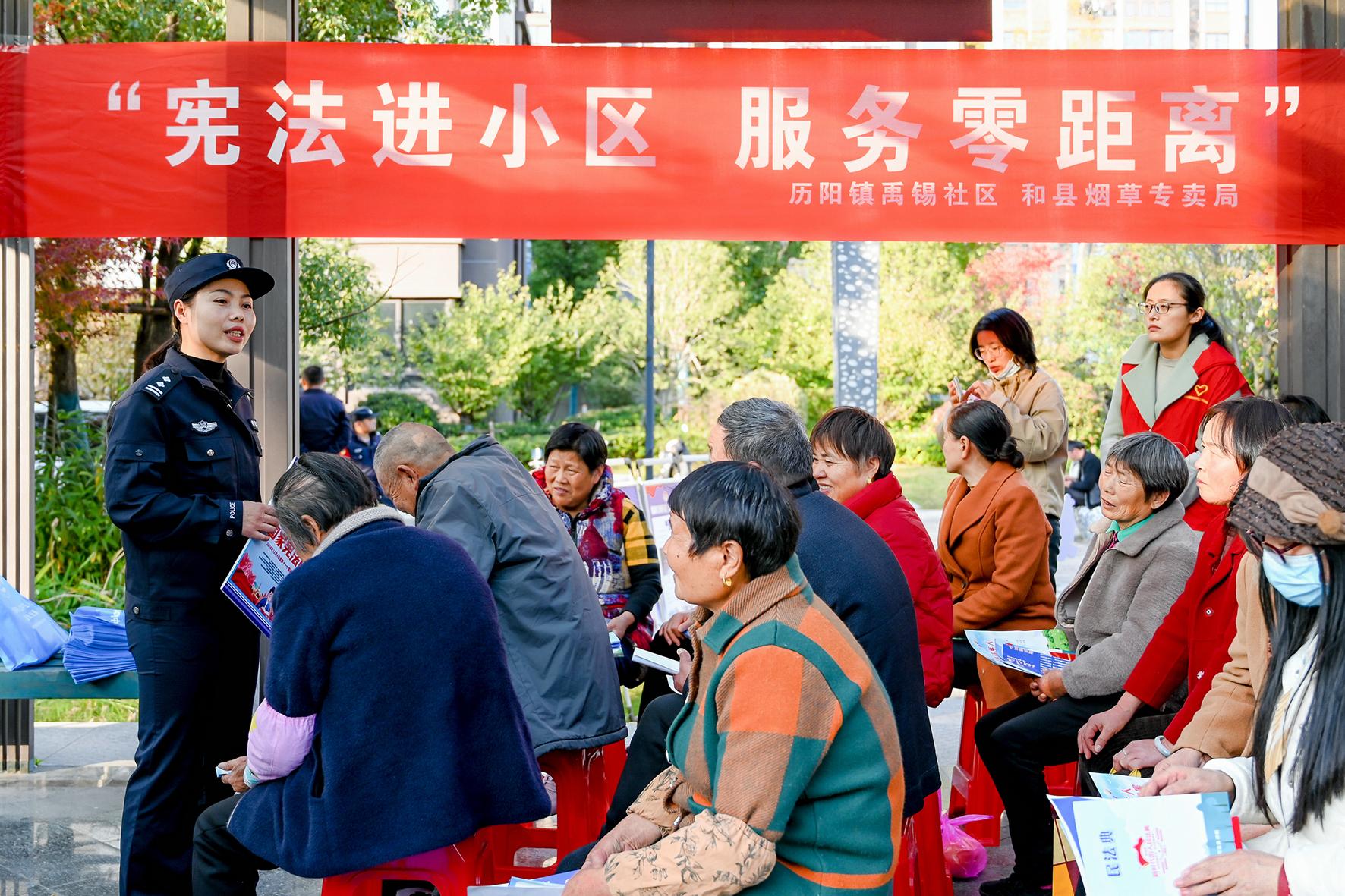 12月3日,安徽省馬鞍山市和縣公安局民警在歷陽(yáng)鎮(zhèn)禹錫社區(qū)向居民宣講憲法知識(shí)。