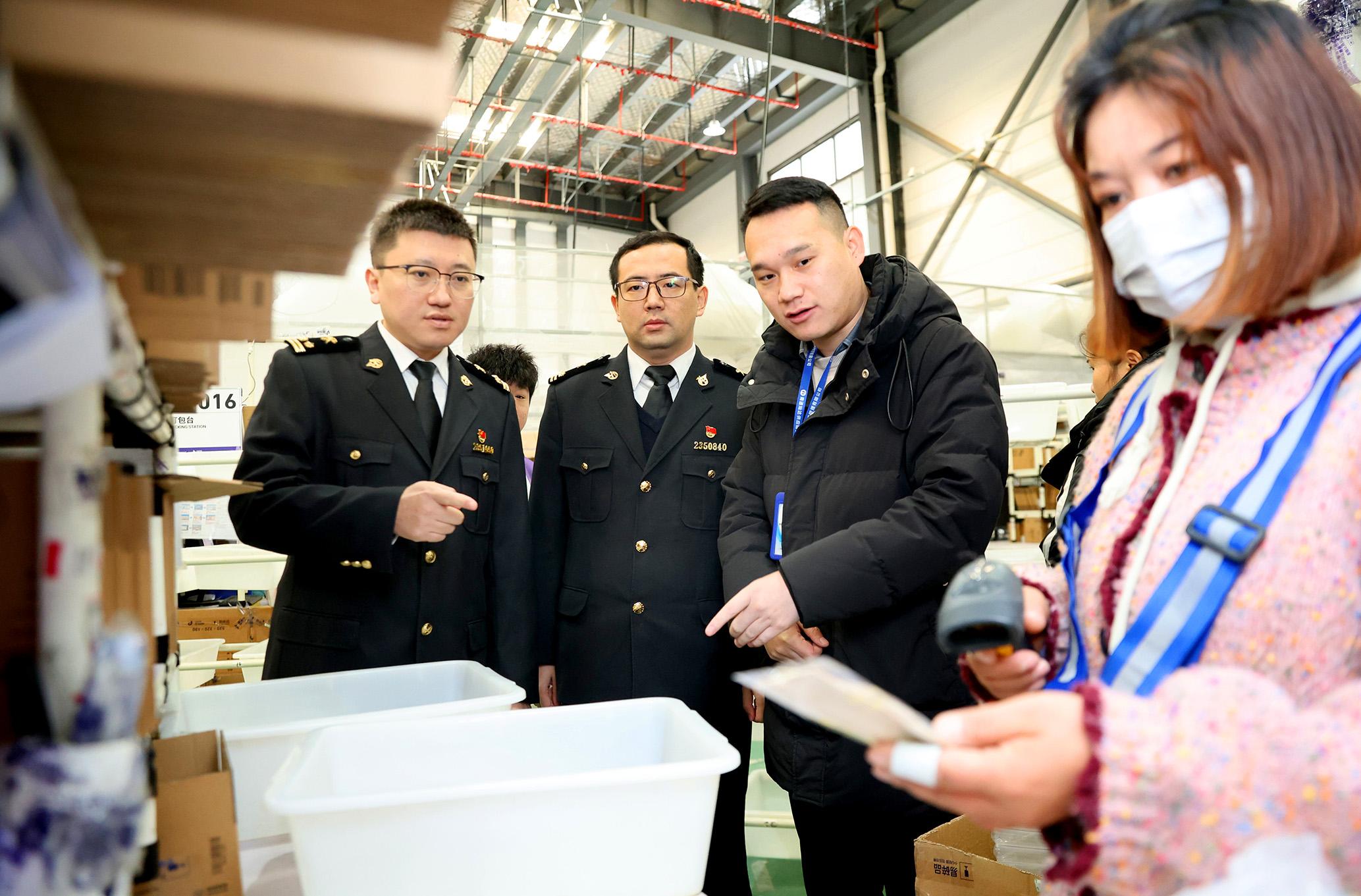 12月12日,在江蘇南通綜合保稅區(qū)燦達(dá)公司跨境倉(cāng)庫(kù),海關(guān)關(guān)員現(xiàn)場(chǎng)查看準(zhǔn)備打包發(fā)運(yùn)的包裹。