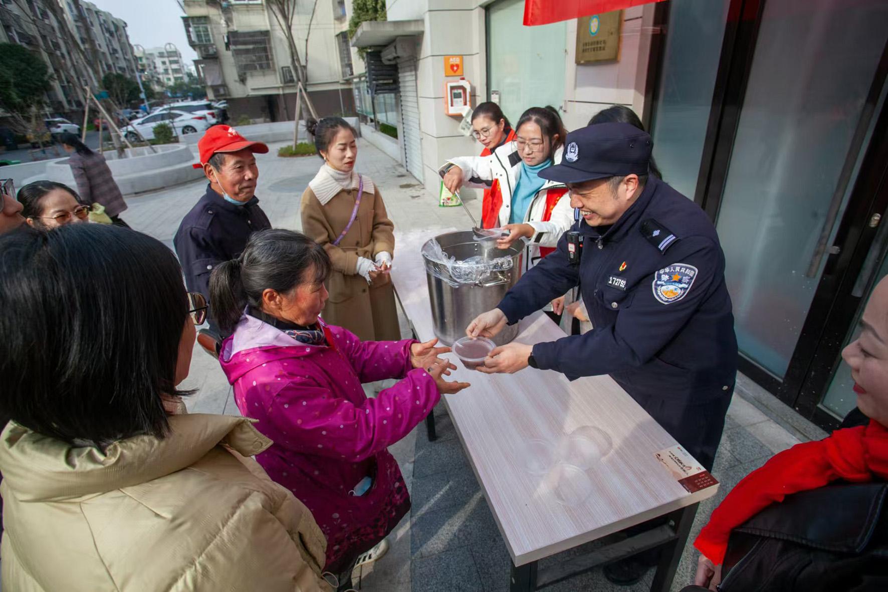 1月7日,浙江省臺州市公安局黃巖分局城東派出所民警和東城街道白楊社區(qū)工作人員一起,在白楊社區(qū)內(nèi)開展分發(fā)八寶粥活動,并進(jìn)行安全防范宣傳。
