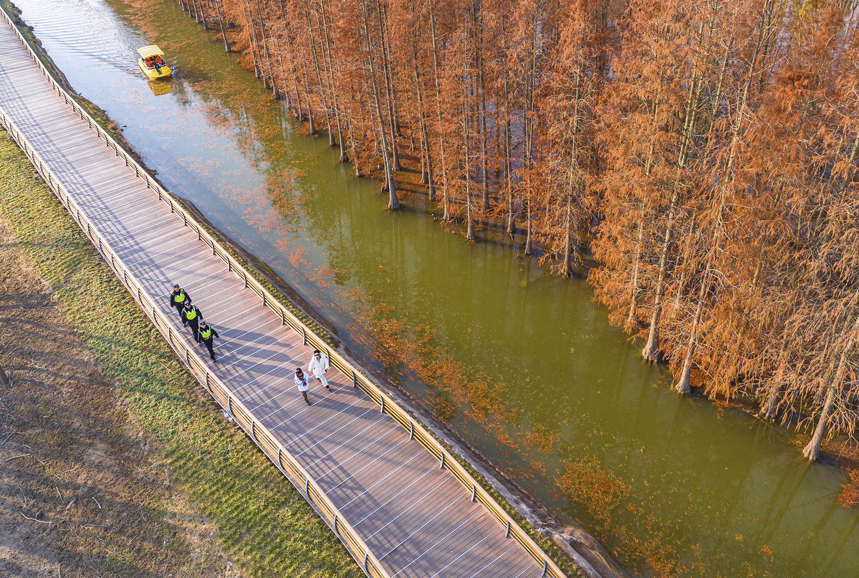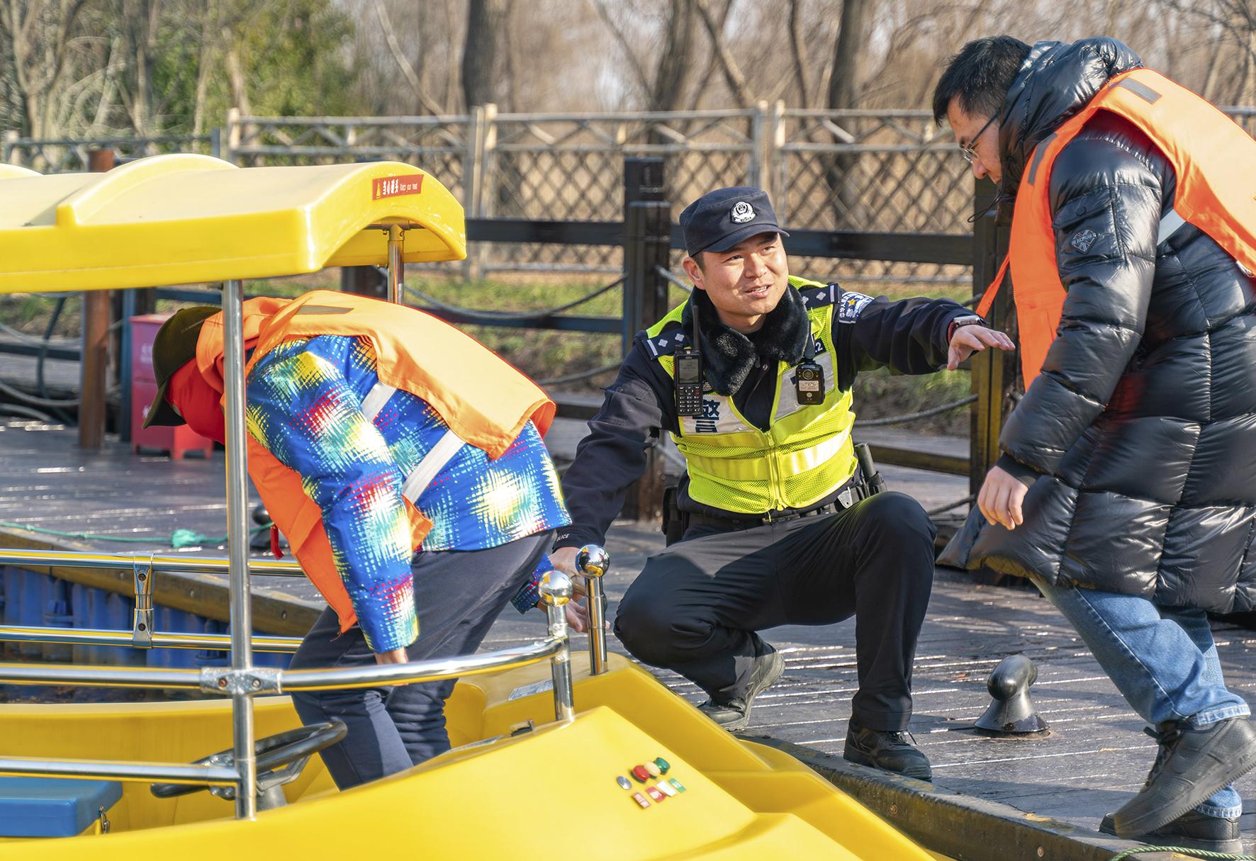 1月13日,上海市公安局崇明分局三星派出所民警在西沙明珠湖景區(qū)開展常態(tài)化巡邏,服務游客。西沙明珠湖景區(qū)是上海首個以生態(tài)為底色的國家5A級旅游景區(qū)。春節(jié)臨近,三星派出所提前謀劃部署,組織警力開展巡邏駐守,提高見警率,切實當好景區(qū)安全的“守護者”。