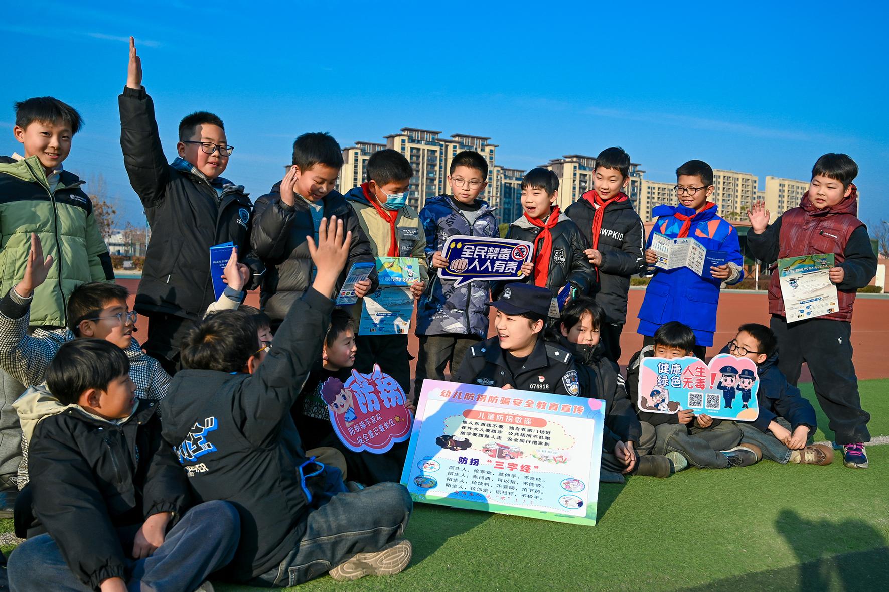 1月14日,在安徽省馬鞍山市和縣實(shí)驗(yàn)小學(xué),轄區(qū)歷陽派出所民警在給學(xué)生講解防拐、防騙、交通安全等知識。寒假來臨,該縣公安機(jī)關(guān)及時(shí)開展“假前最后一課”宣傳活動(dòng)。