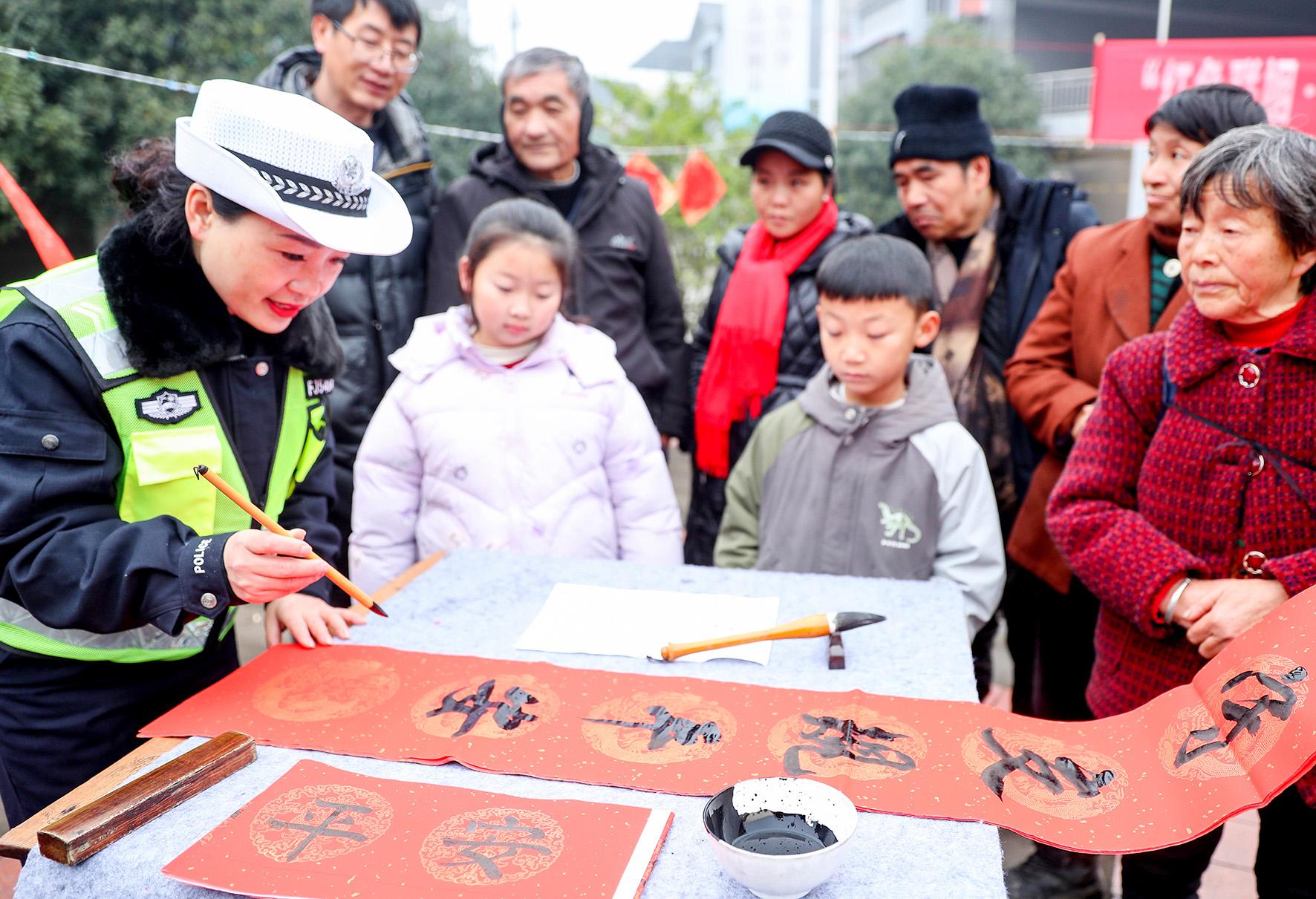 1月15日,四川省華鎣市公安局交通警察大隊的書法愛好者,在永興鎮(zhèn)馬架坪村文體廣場,為群眾書寫“平安春聯(lián)”。