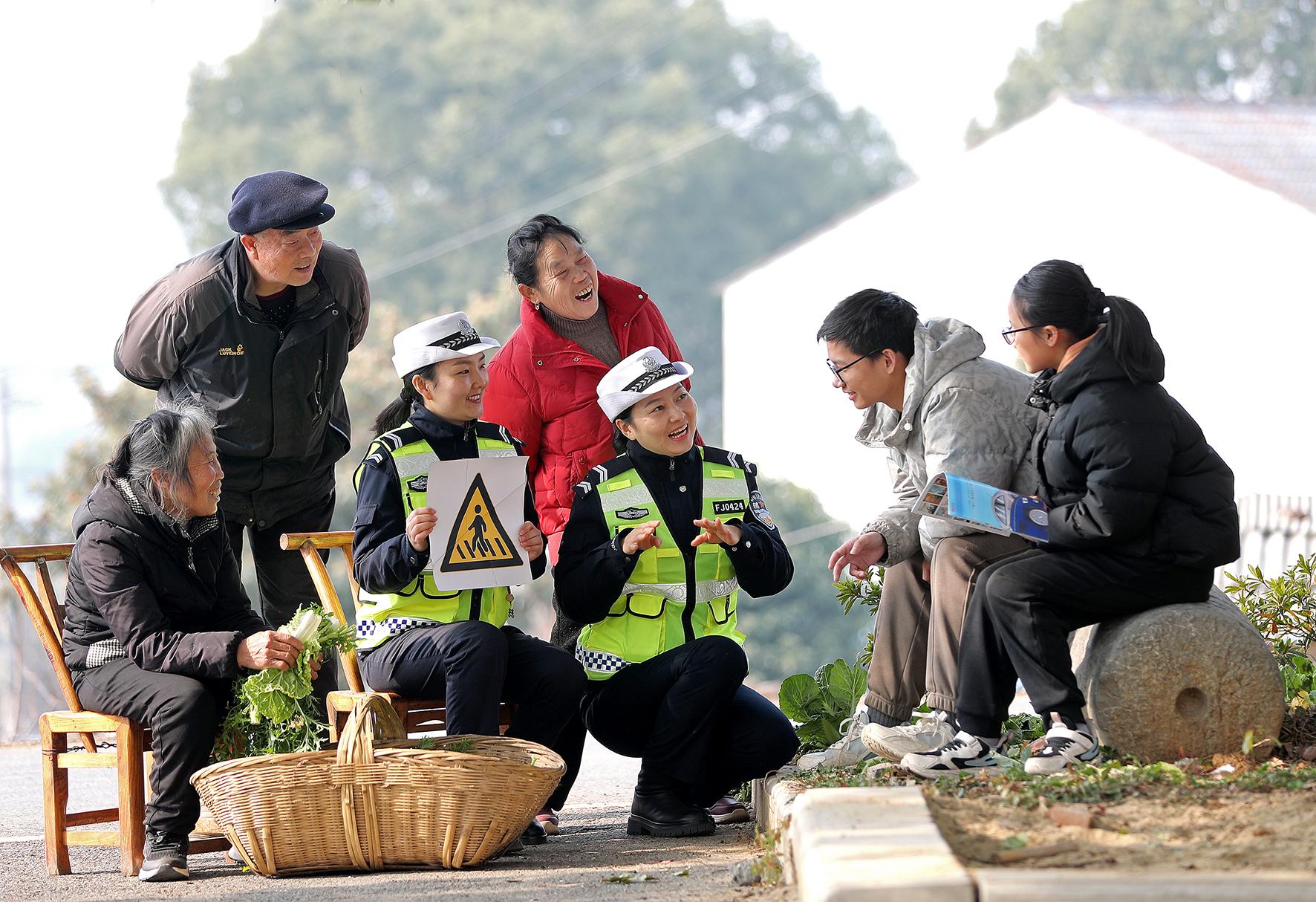 1月21日,湖北省荊門市公安局交警支隊民輔警在東寶區(qū)牌樓鎮(zhèn)來龍村,向村里的老人和孩子開展交通安全知識宣傳。