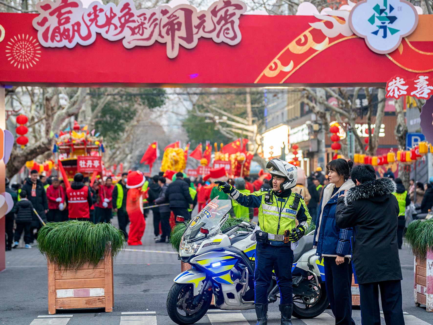 2月12日,安徽省蕪湖市公安局鏡湖分局聯(lián)合鏡湖交警大隊抽調(diào)近百名警力為大型龍燈巡游活動保駕護航。