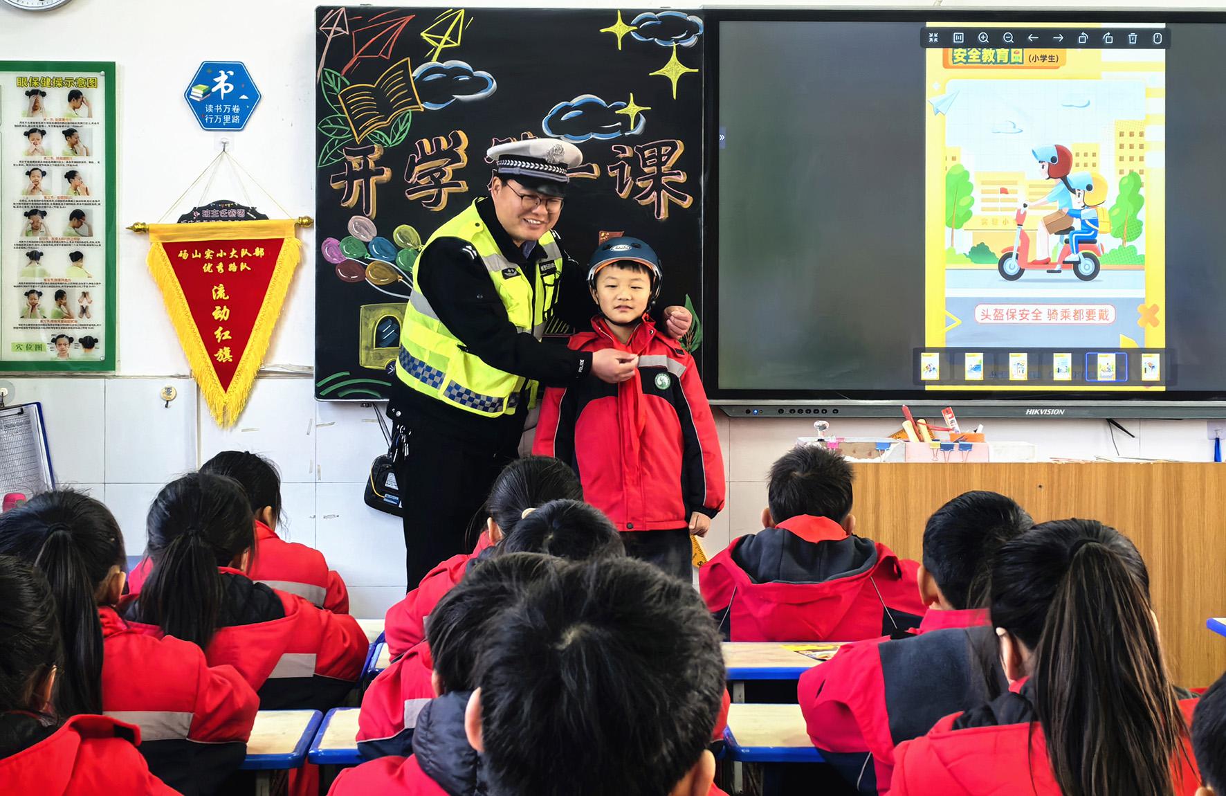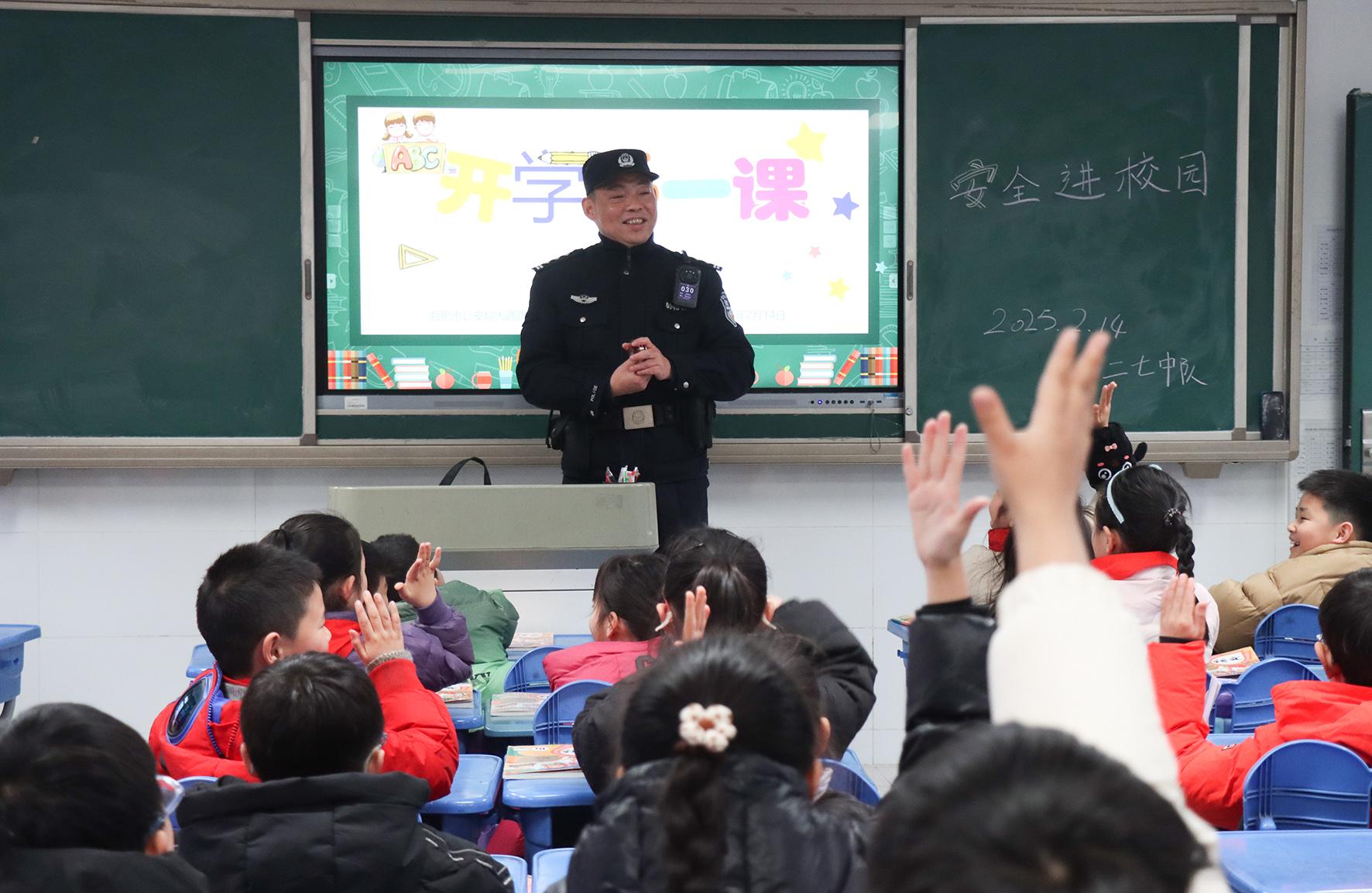 2月14日,安徽省合肥市公安局交警支隊(duì)廬陽大隊(duì)民警走進(jìn)育新小學(xué)開展“新春開學(xué)第一課”安全宣教活動(dòng)。