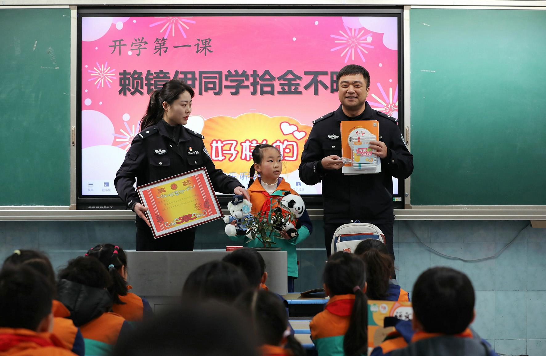 2月14日,安徽省寧國(guó)市公安局西津派出所借助開學(xué)“第一課”開展“送獎(jiǎng)進(jìn)課堂”思政教育。民警在表揚(yáng)拾金不昧學(xué)生的同時(shí),教育引導(dǎo)同學(xué)們要傳承弘揚(yáng)中華民族傳統(tǒng)美德,爭(zhēng)做新時(shí)代好少年。