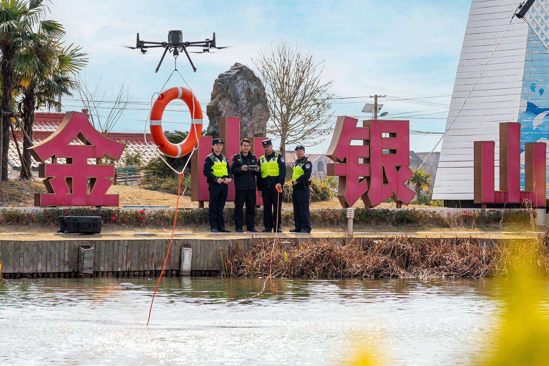 圖為2月21日,橫沙派出所民輔警利用無人機(jī)開展溺水救援訓(xùn)練。