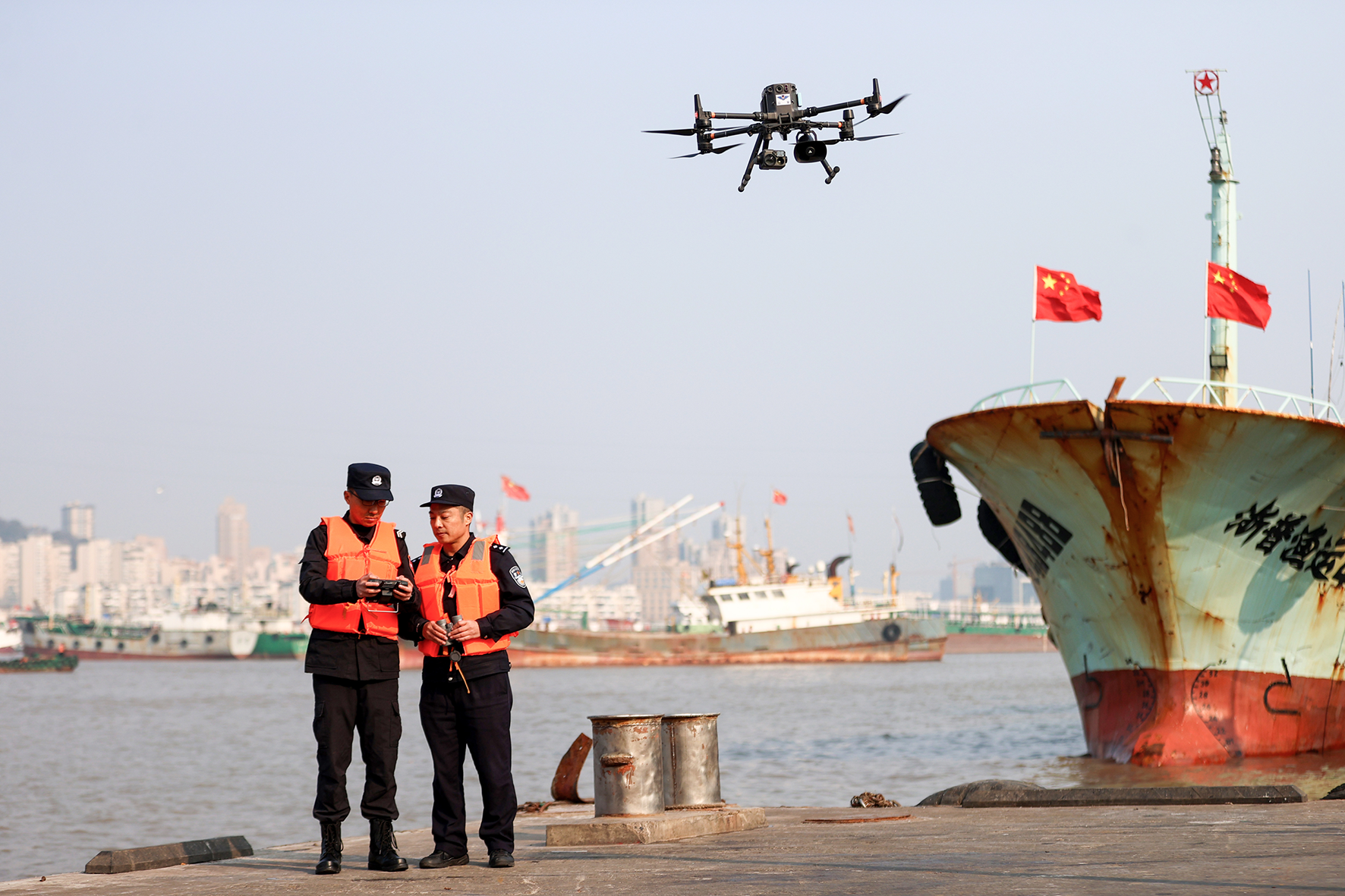 2月24日,浙江省舟山市公安局普陀區(qū)分局巡特警大隊聯(lián)合沈家門派出所,組織民輔警利用警用無人機對轄區(qū)漁港碼頭進(jìn)行空中巡查,加強轄區(qū)海上治安防控工作力度,守護(hù)漁船民安全生產(chǎn)。
