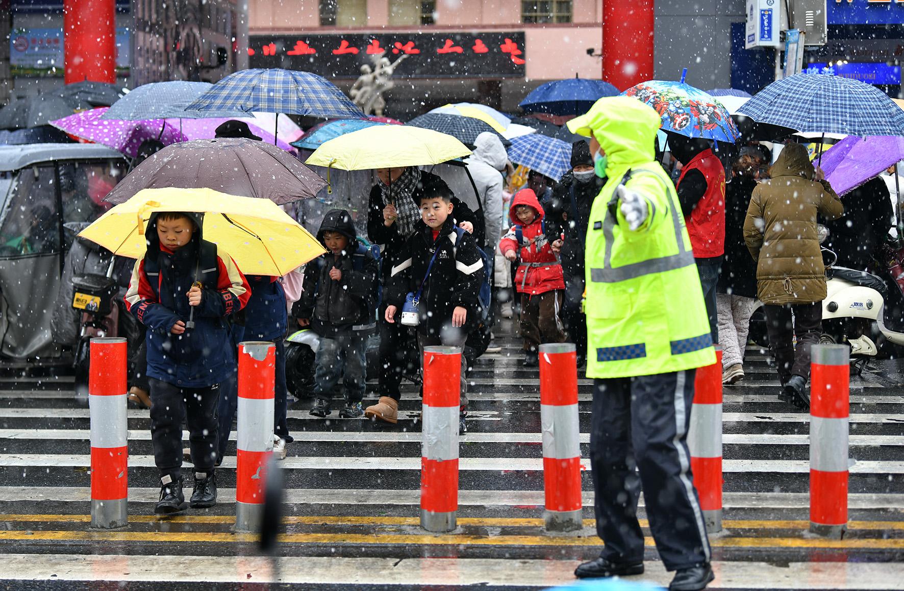 3月2日,山東省濟(jì)南市出現(xiàn)大風(fēng)降溫雨雪天氣。濟(jì)南市公安局市中區(qū)分局立即啟動(dòng)惡劣天氣應(yīng)急預(yù)案,組織警力在重點(diǎn)路段、十字路口執(zhí)勤巡邏,確保群眾出行安全。