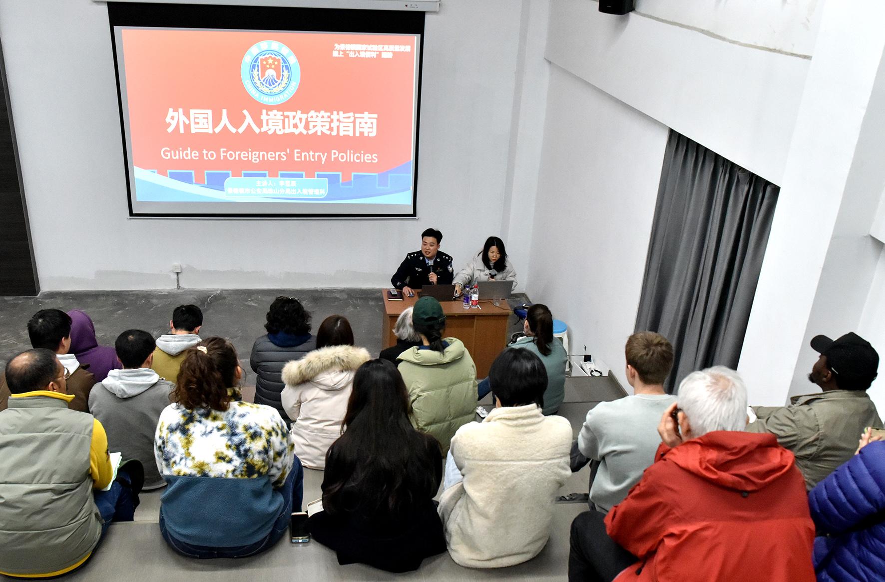 3月10日,在江西省景德鎮(zhèn)陶溪川國際陶藝工作室,景德鎮(zhèn)市公安局珠山分局出入境民警正在向外籍人士宣講240小時過境免簽政策。