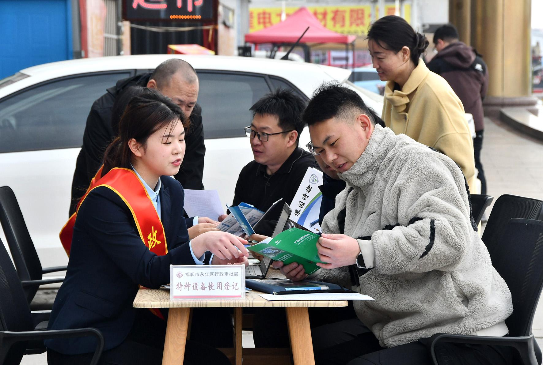 3月14日,河北省邯鄲市永年區(qū)行政審批局把政務服務“辦公桌”搬到企業(yè)群眾“家門口”,組織工作人員深入緊固件產業(yè)聚集區(qū),現(xiàn)場為企業(yè)和群眾集中辦理特種設備使用登記業(yè)務。