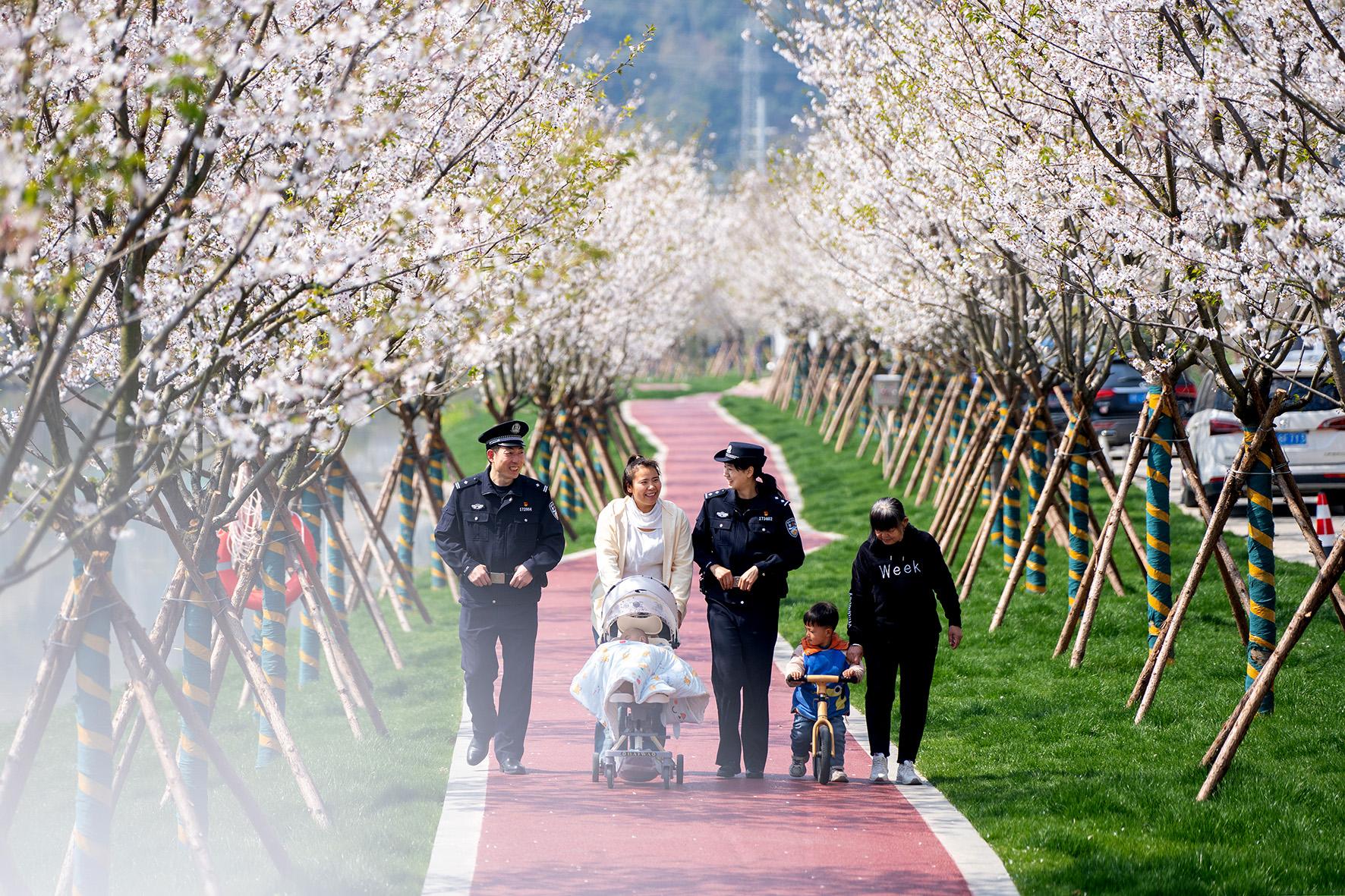 3月20日,浙江省臺州市公安局黃巖分局城東派出所民警在東城綠道櫻花樹下巡邏執(zhí)勤,服務游客。