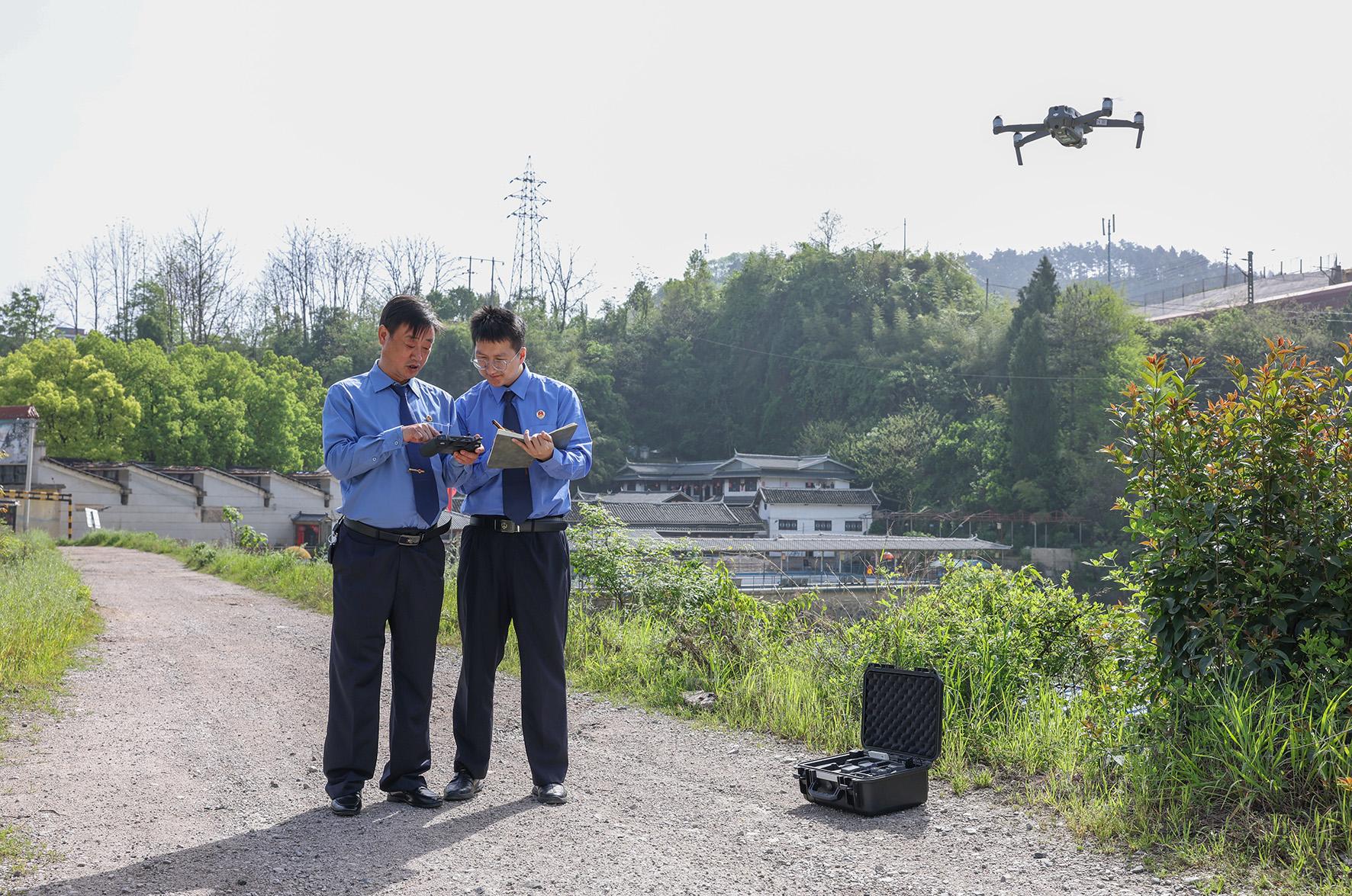4月14日,貴州省銅仁市玉屏侗族自治縣人民檢察院檢察干警對(duì)一起未批先建違法占地案件采取無人機(jī)航拍取證。